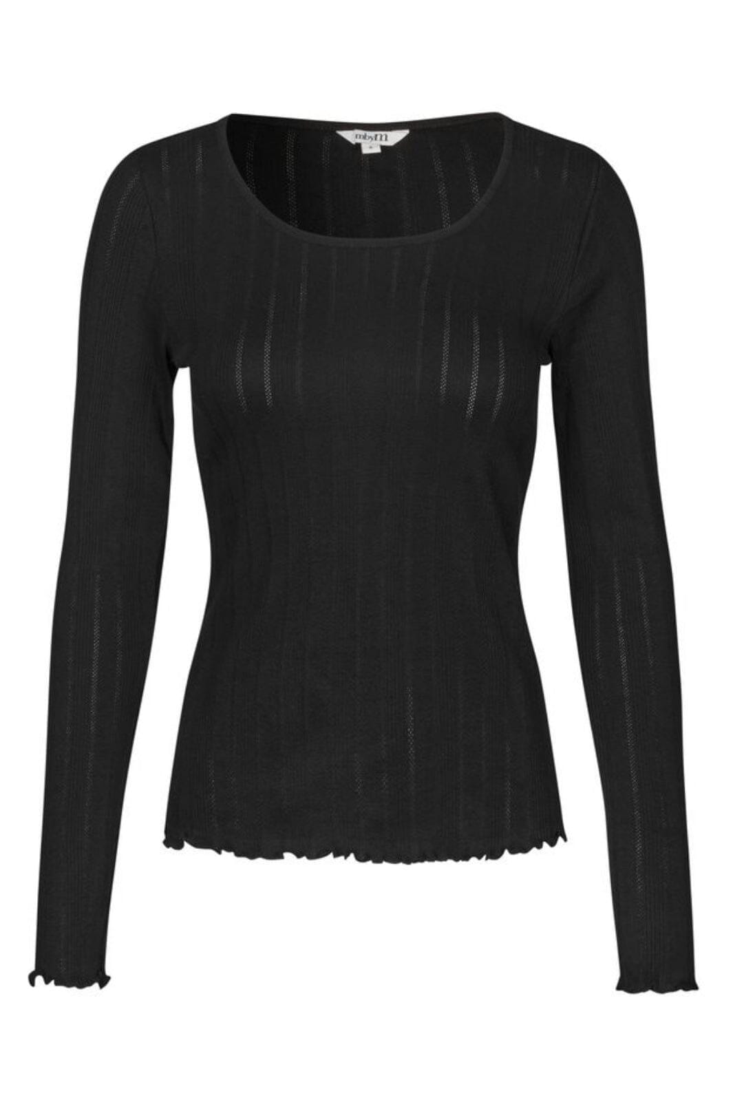 Schwarzes Langarmshirt von MbyM mit gerippter Textur und Rüschen. Das Shirt hat einen runden Halsausschnitt und eine figurbetonte Passform mit vertikalen Streifen im Stoff.