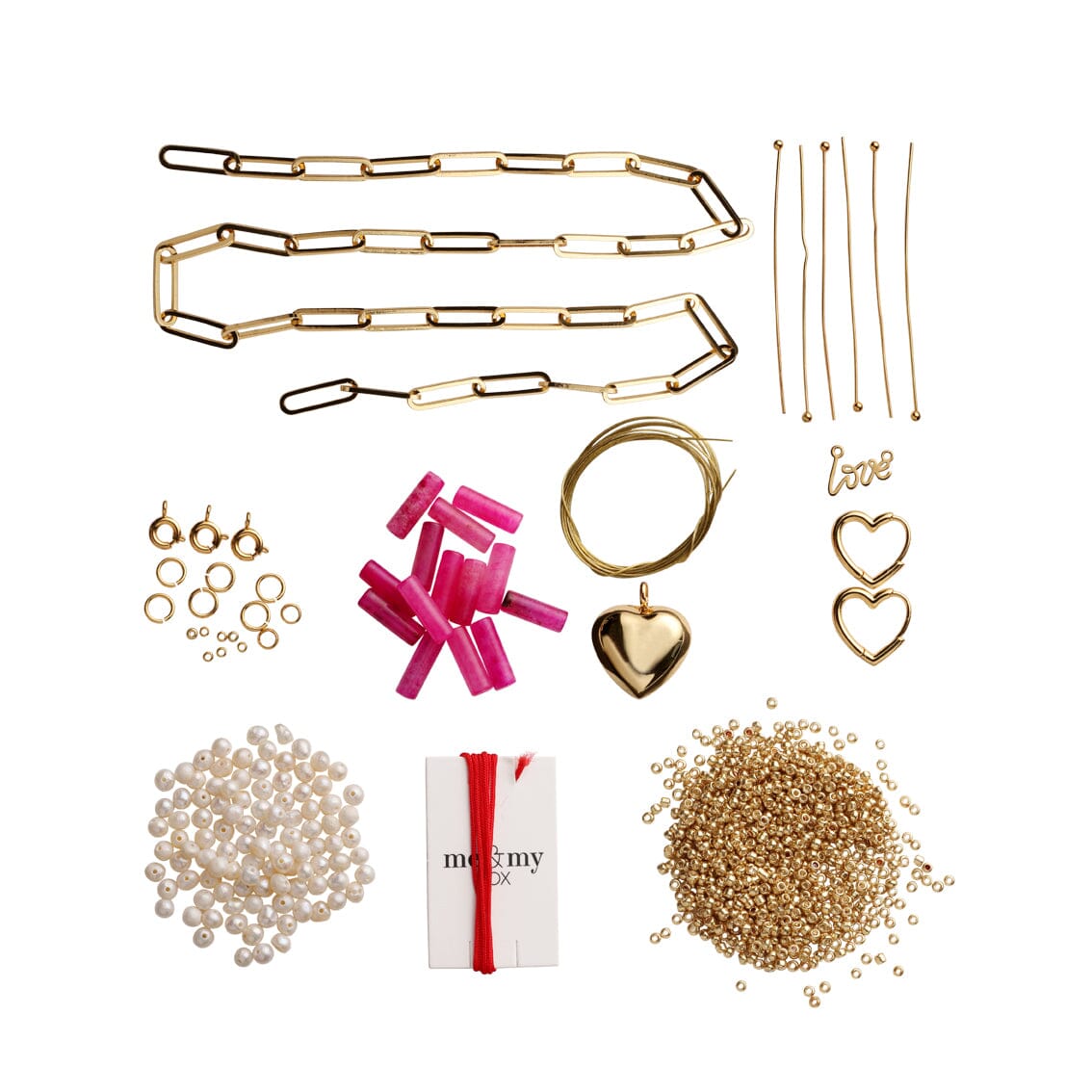 DIY Schmuckbox von Me & My Box mit rosa Röhrenperlen und Herzanhänger. Die Box enthält Teile aus 18K vergoldetem Messing und 925 silberbeschichteten Materialien zur Herstellung persönlicher Schmuckstücke.