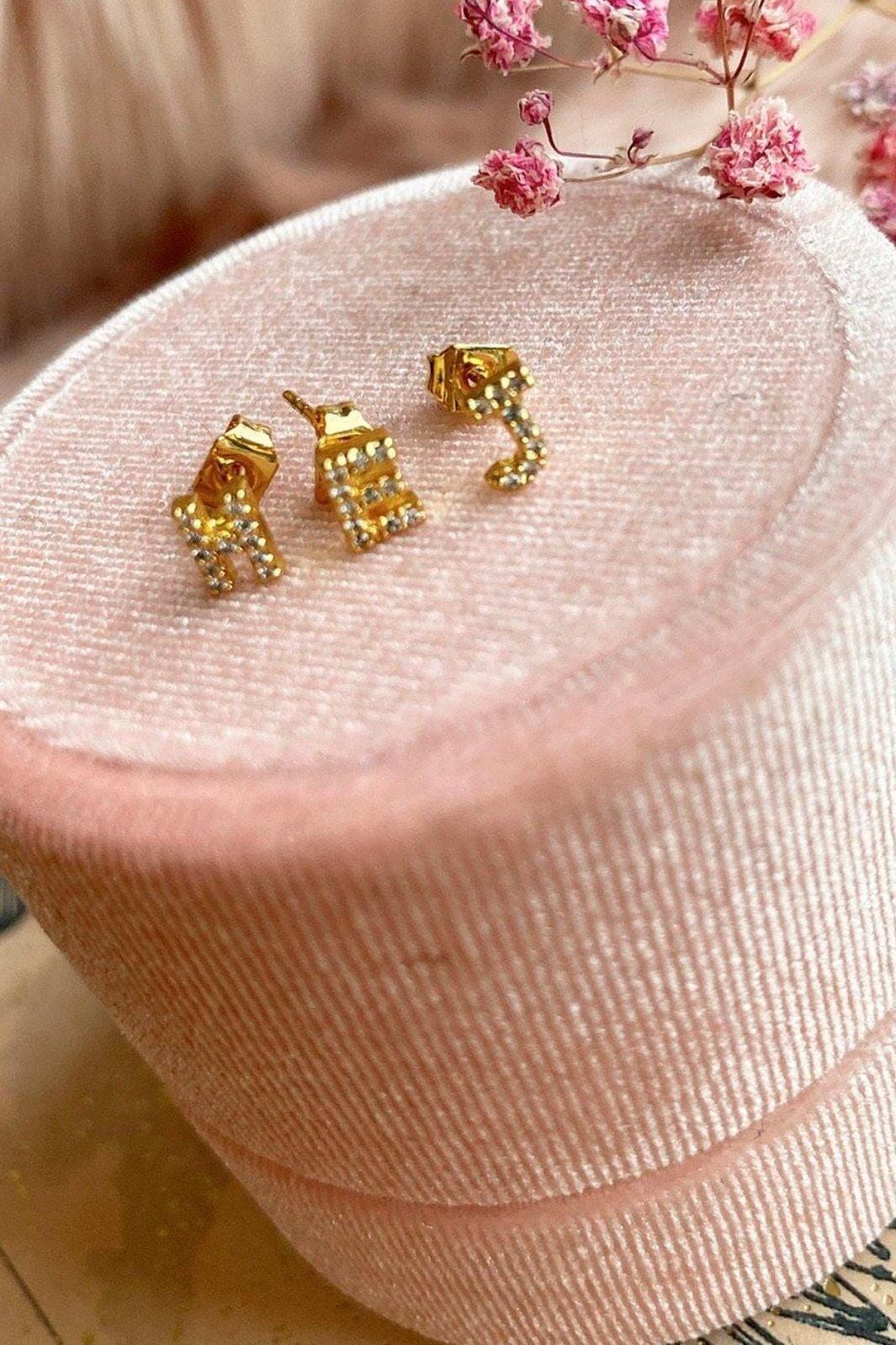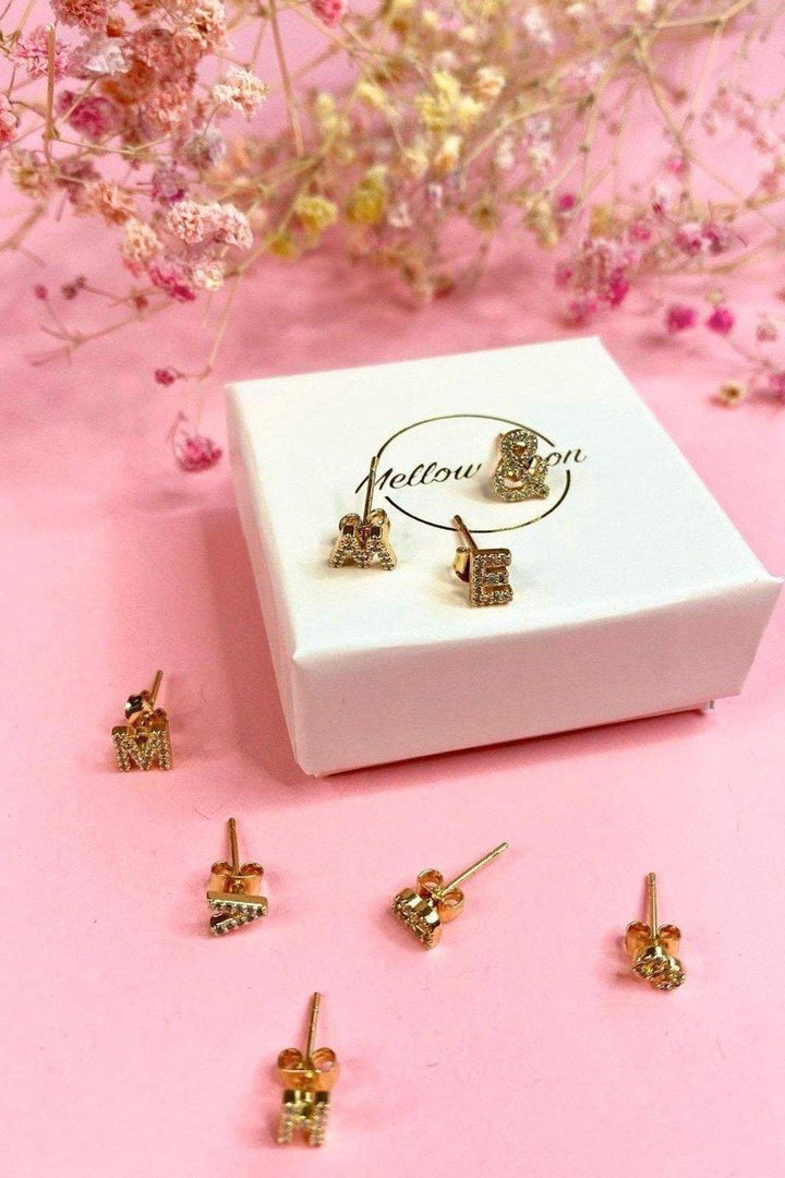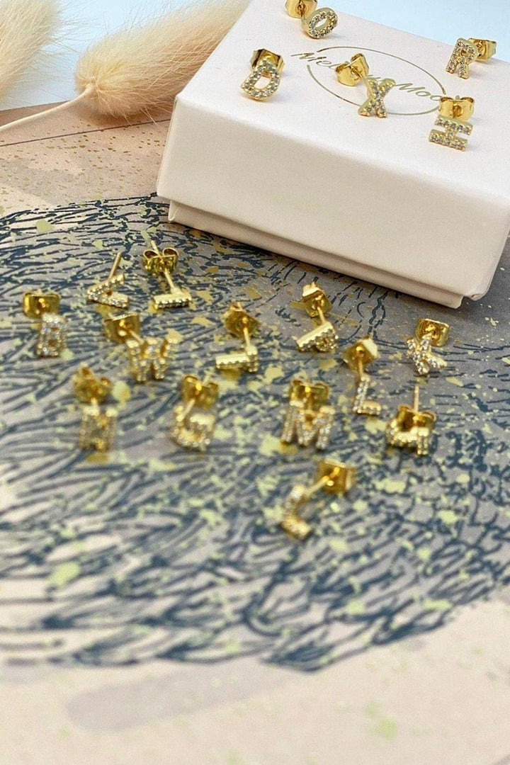 Vergoldete Buchstabenohrringe von Mellow Moon mit kleinen Steinen. Der Ohrring hat eine persönliche Note mit einem Buchstabendesign, bei dem die Steine einen funkelnden Ausdruck verleihen.