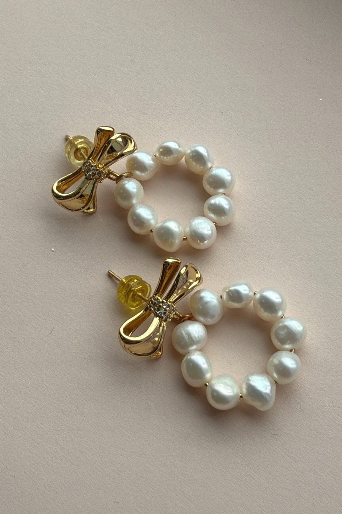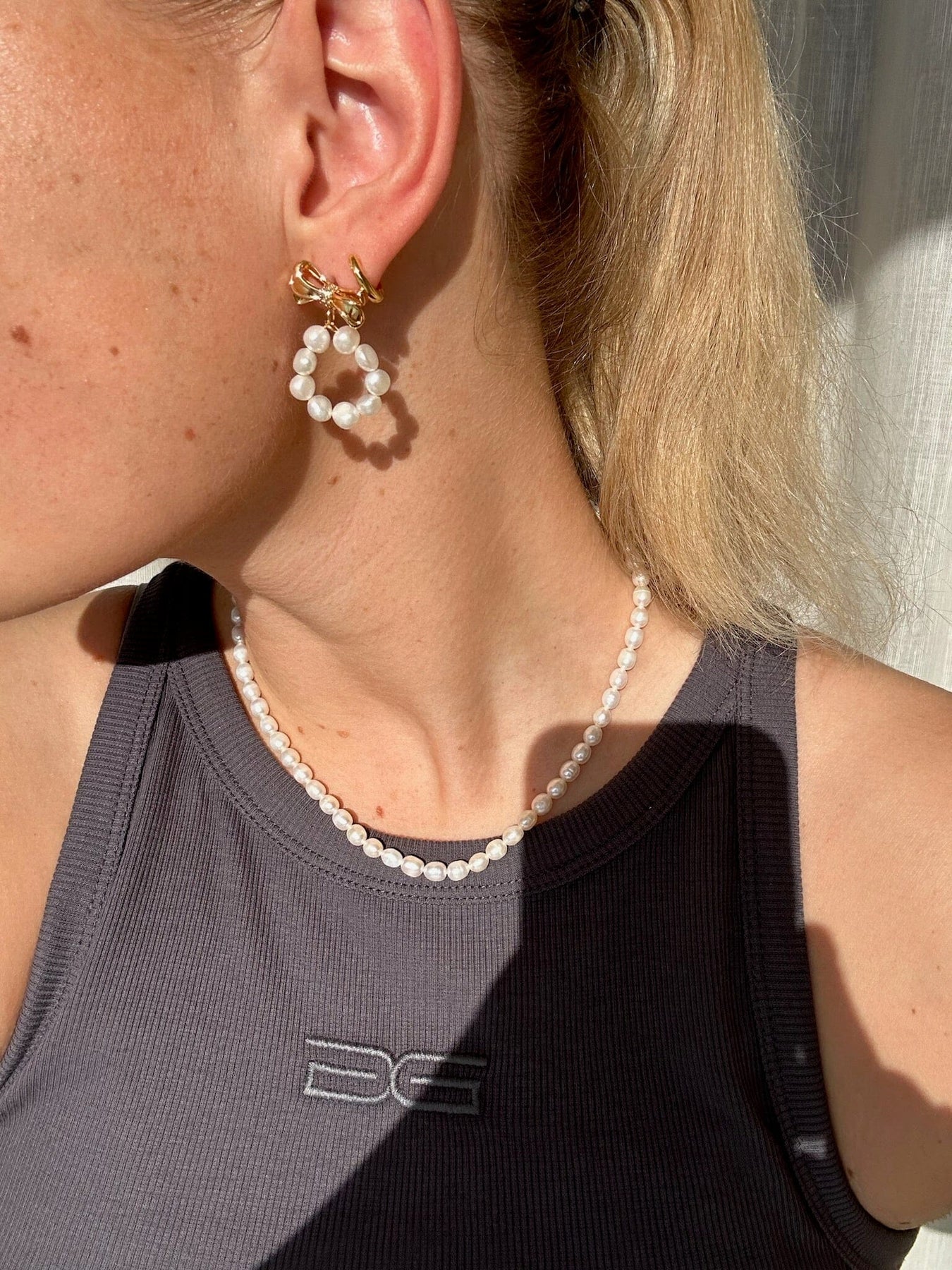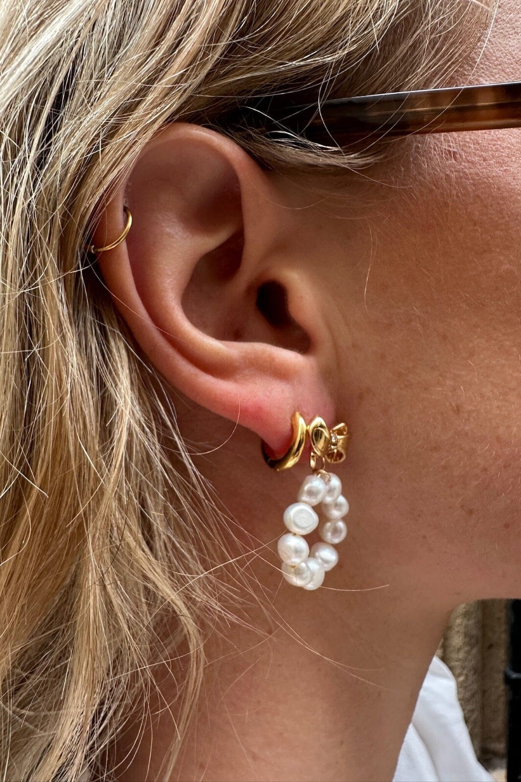 Vergoldete Creolen von Mellow Moon aus rostfreiem Stahl mit Bogenform. Die Ohrringe haben kleine weiße Perlen und ein leichtes Gewicht, das sie angenehm zu tragen macht.