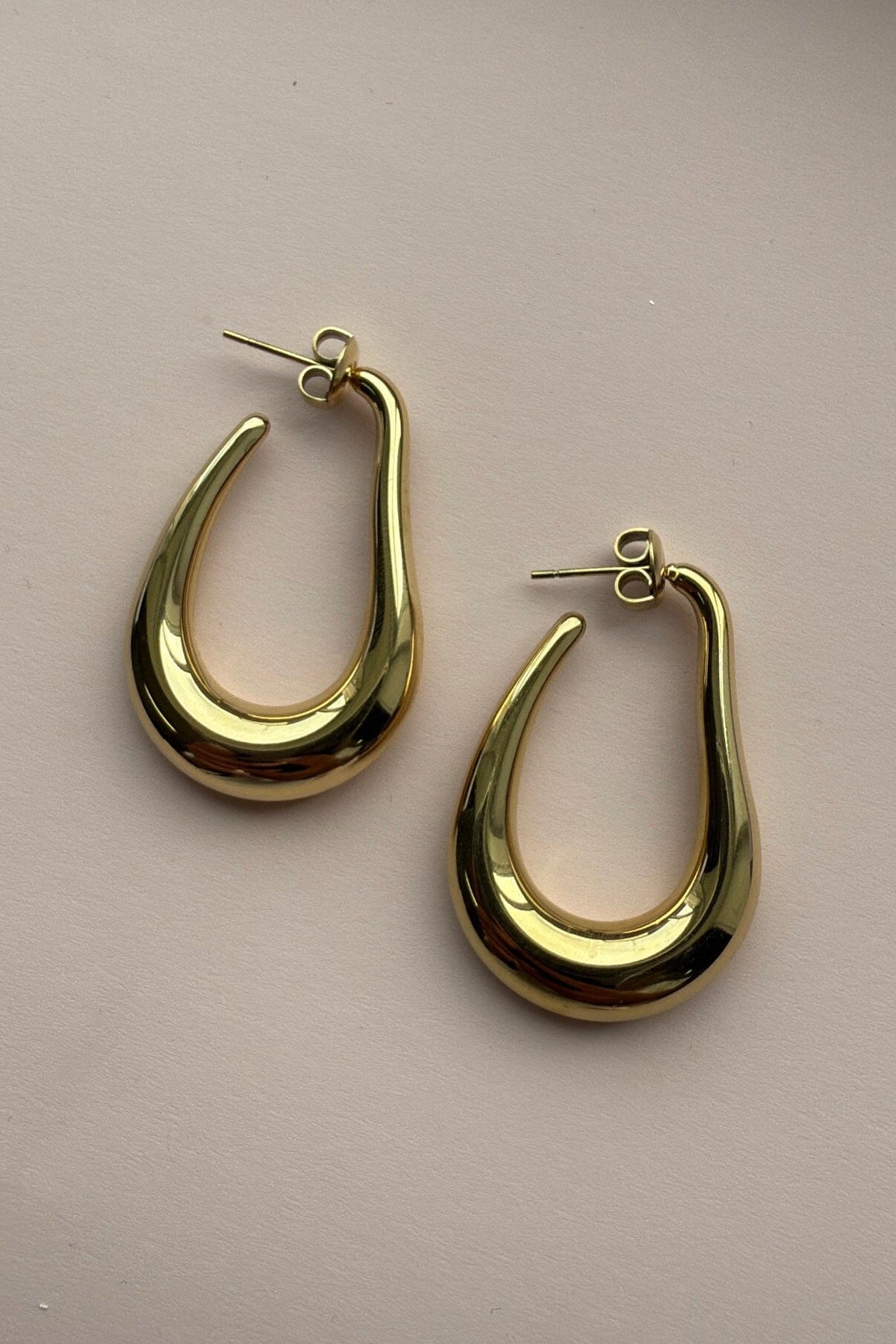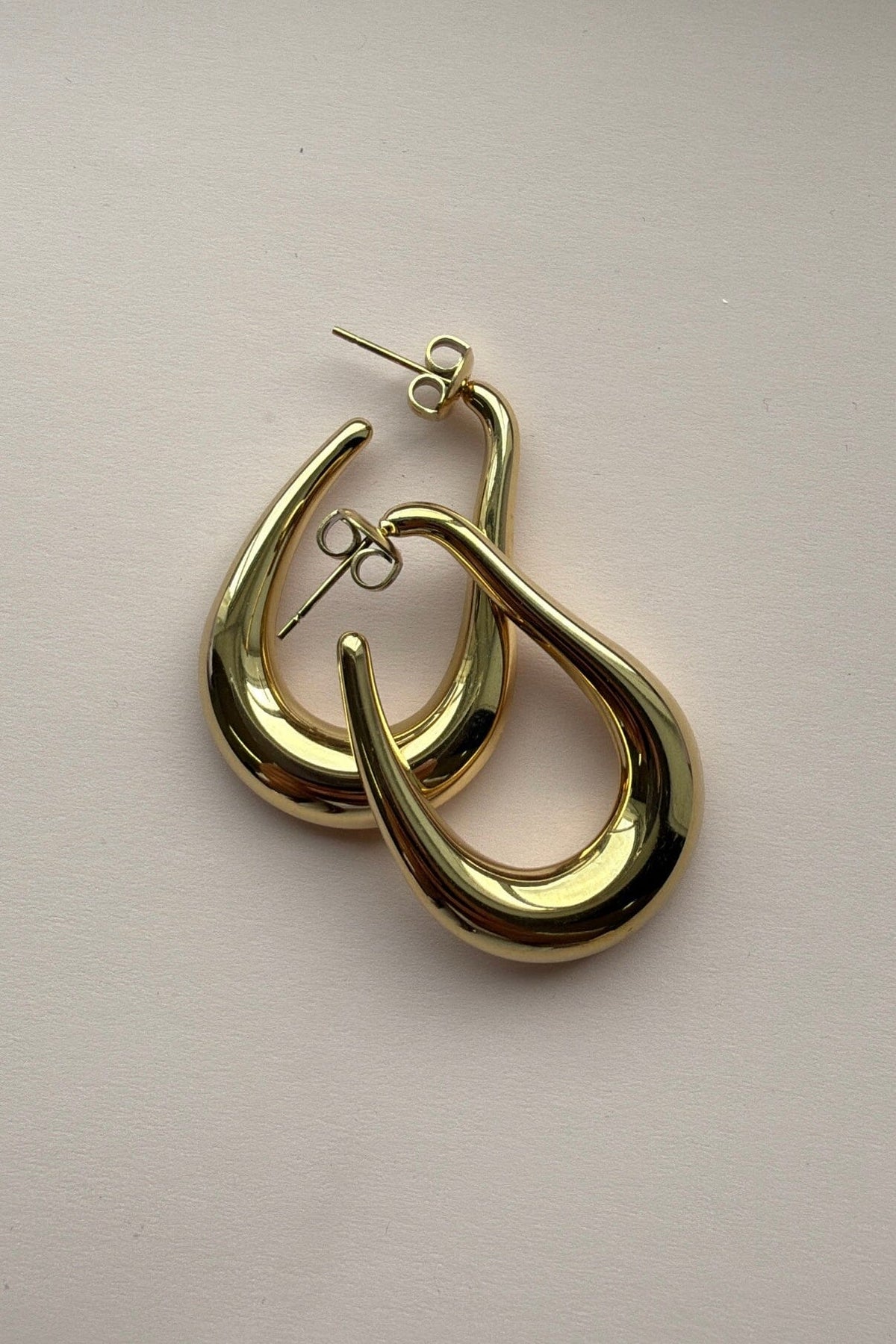 Goldene Ohrringe von Mellow Moon mit einer gebogenen Form und glatter Oberfläche. Die Ohrringe haben ein poliertes Finish, das einen glänzenden Ausdruck verleiht.