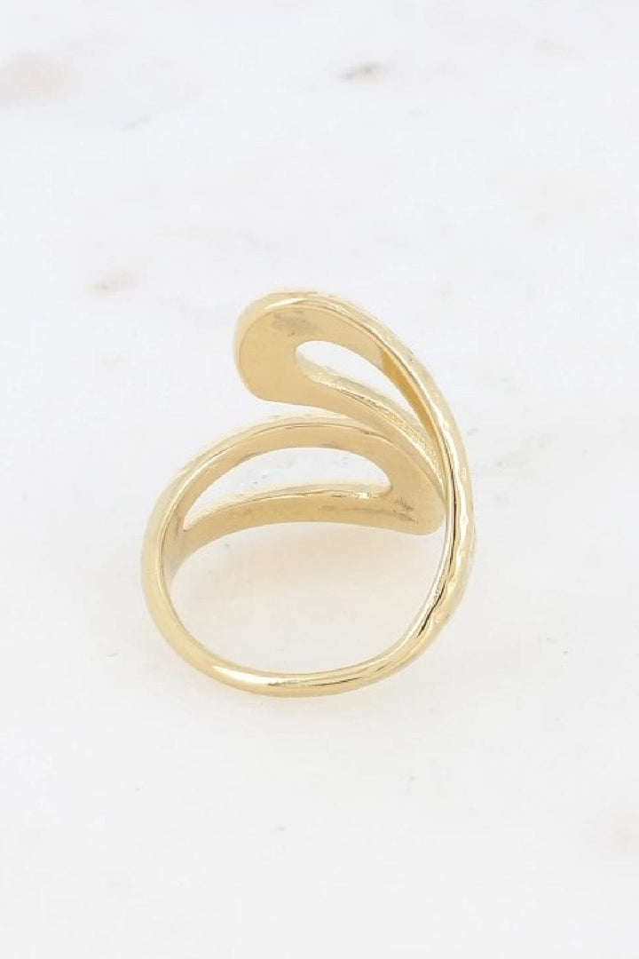 Vergoldeter Ring von Mellow Moon mit gehämmerter Oberfläche. Der Ring besteht aus rostfreiem Stahl mit einer goldenen Oberfläche und hat eine charakteristische asymmetrische Form mit geschwungenen Linien.