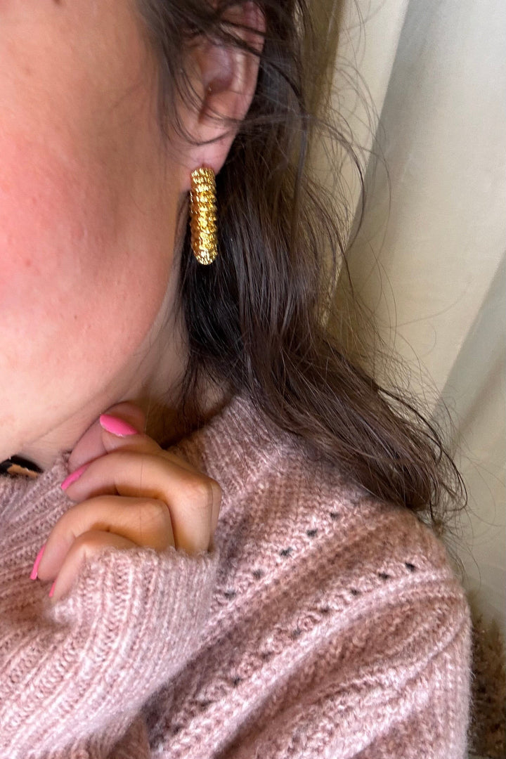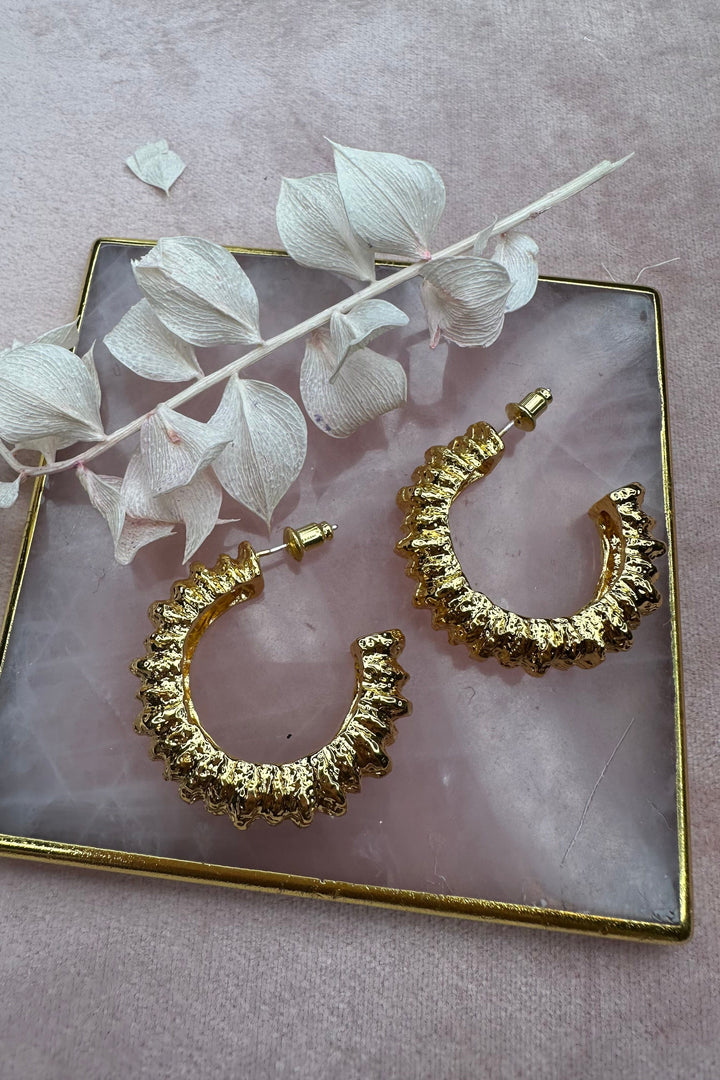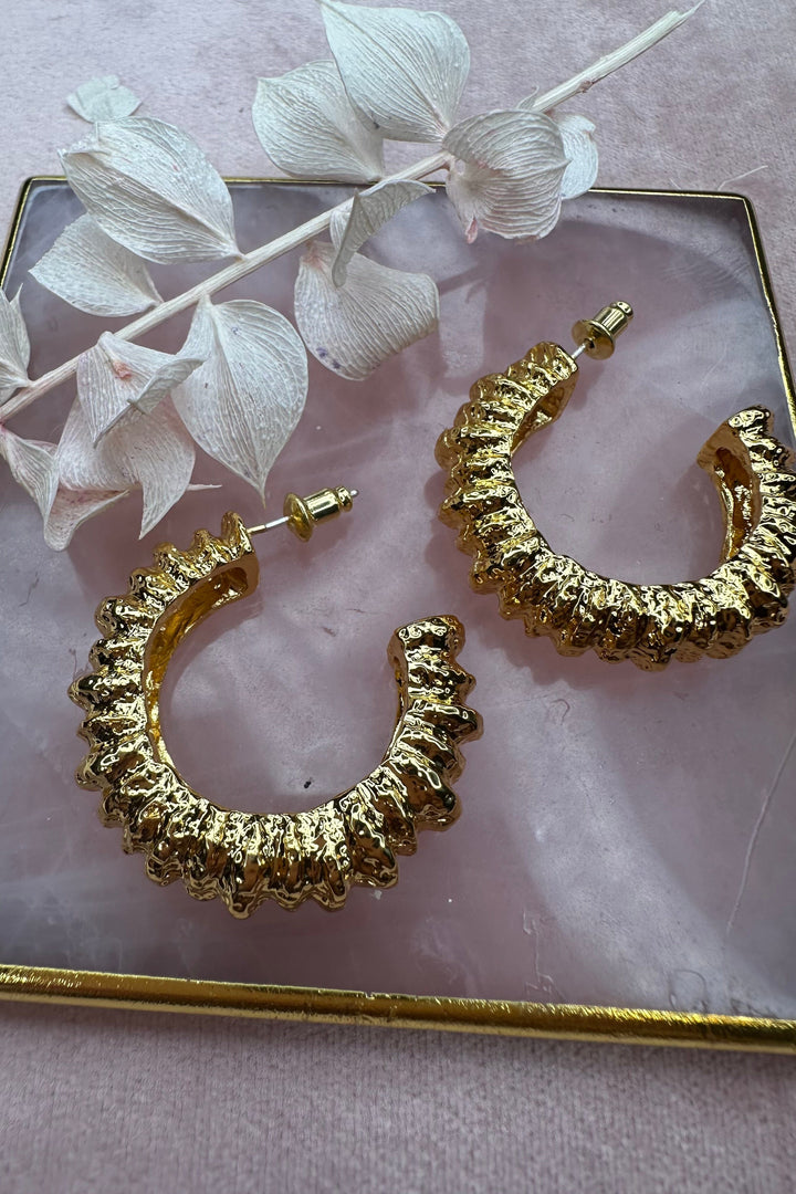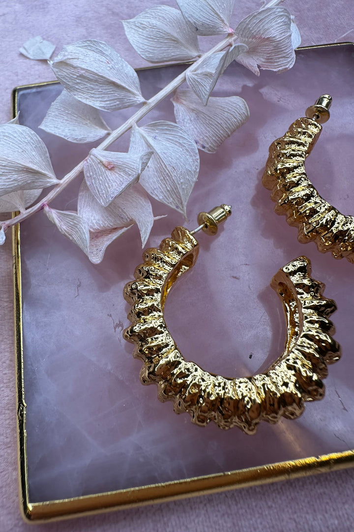 Vergoldete Creolen von Mellow Moon mit strukturierter Oberfläche und gewelltem Rand. Die Ohrringe haben eine raue Struktur auf der Außenseite und schließen mit einem praktischen Steckverschluss.