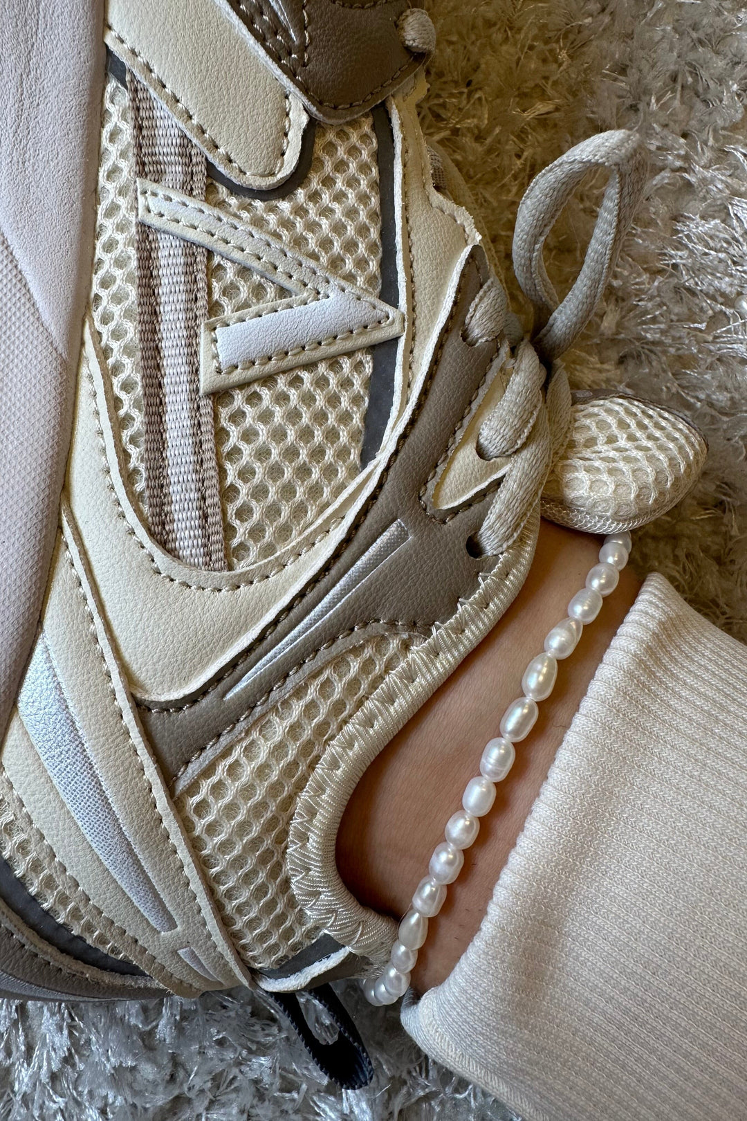 Fußkette von Mellow Moon mit weißen Süßwasserperlen. Sie ist aus 3-4 mm Perlen auf einer elastischen Kette mit 18 Karat Vergoldung gefertigt.