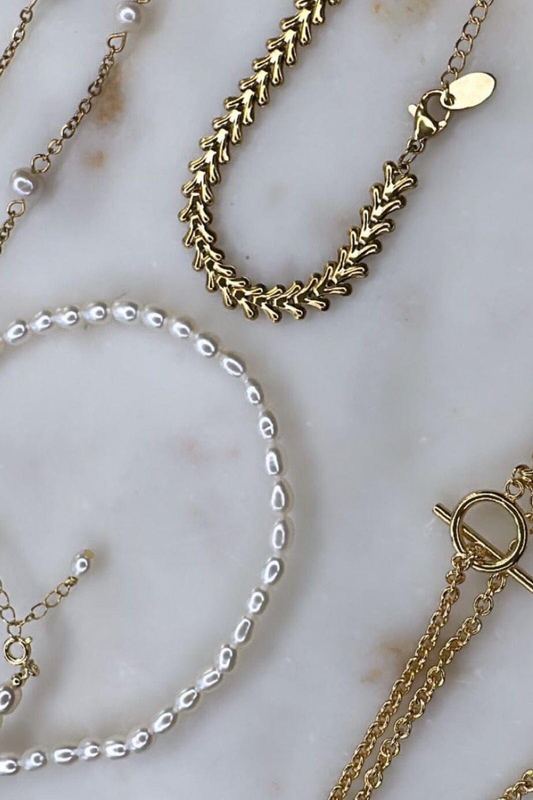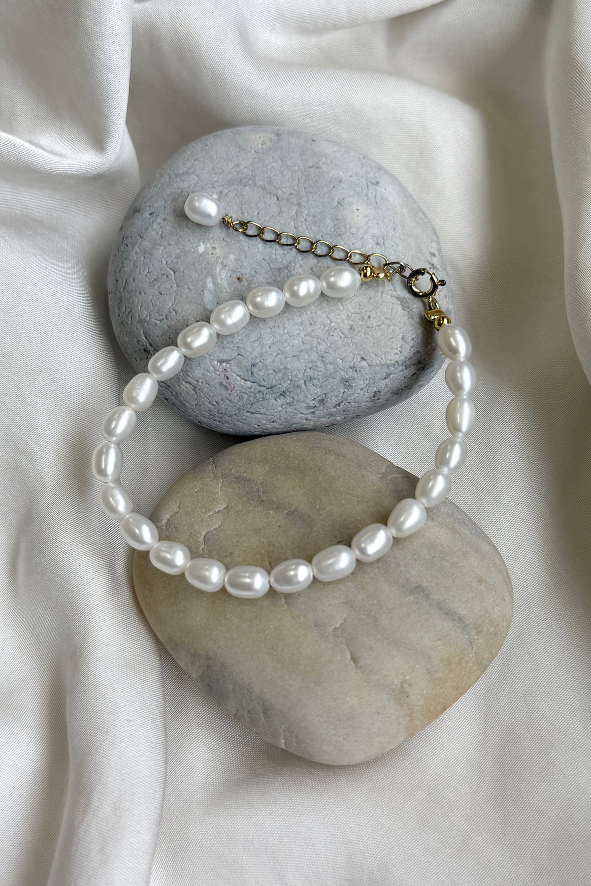 Süßwasserperlenarmband von Mellow Moon mit 4 mm Perlen und vergoldeter Oberfläche. Das Armband besteht aus echten Süßwasserperlen und 18 Karat vergoldetem Sterlingsilber.