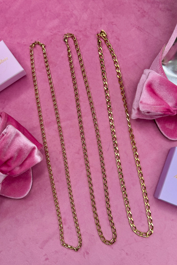 Vergoldete Halskette von Mellow Moon mit Figaro-Mesh-Design. Die Kette hat variierende Stärken von 4 bis 10 Millimetern und eine Länge von 60 Zentimetern.