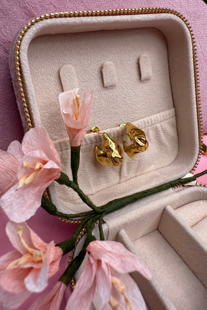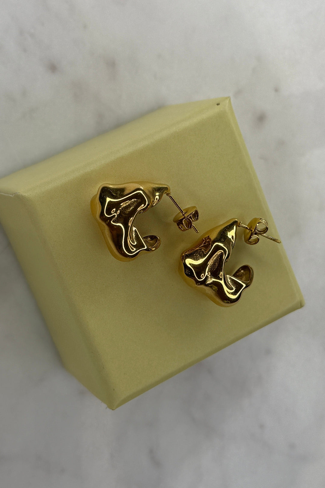 Vergoldete Ohrringe von Mellow Moon mit abstrakter Form. Sie haben eine glänzende Oberfläche und ein künstlerisches Design, das sie besonders bemerkenswert macht.