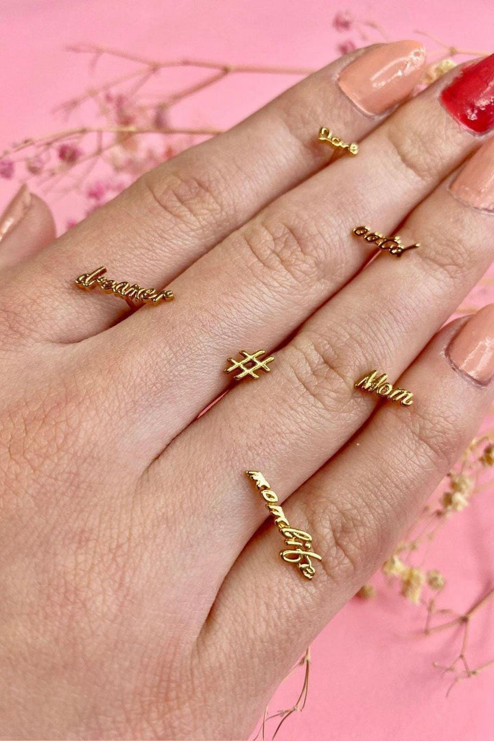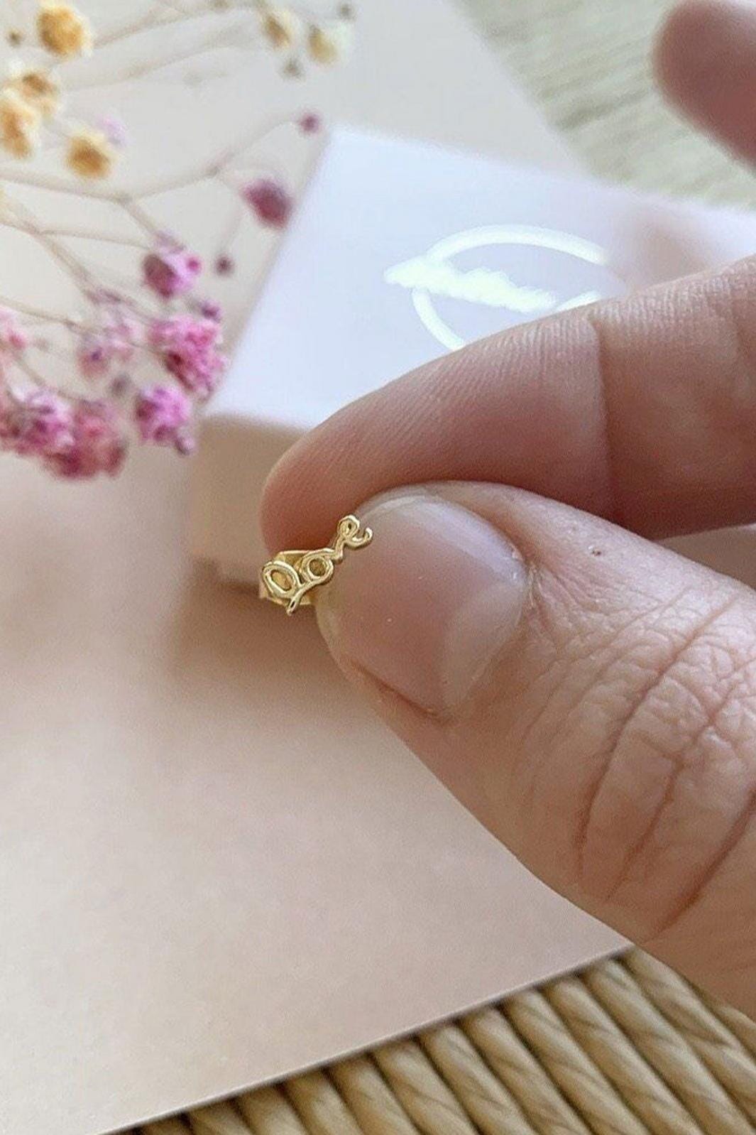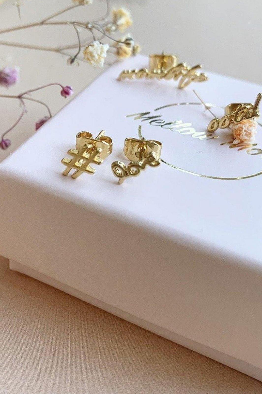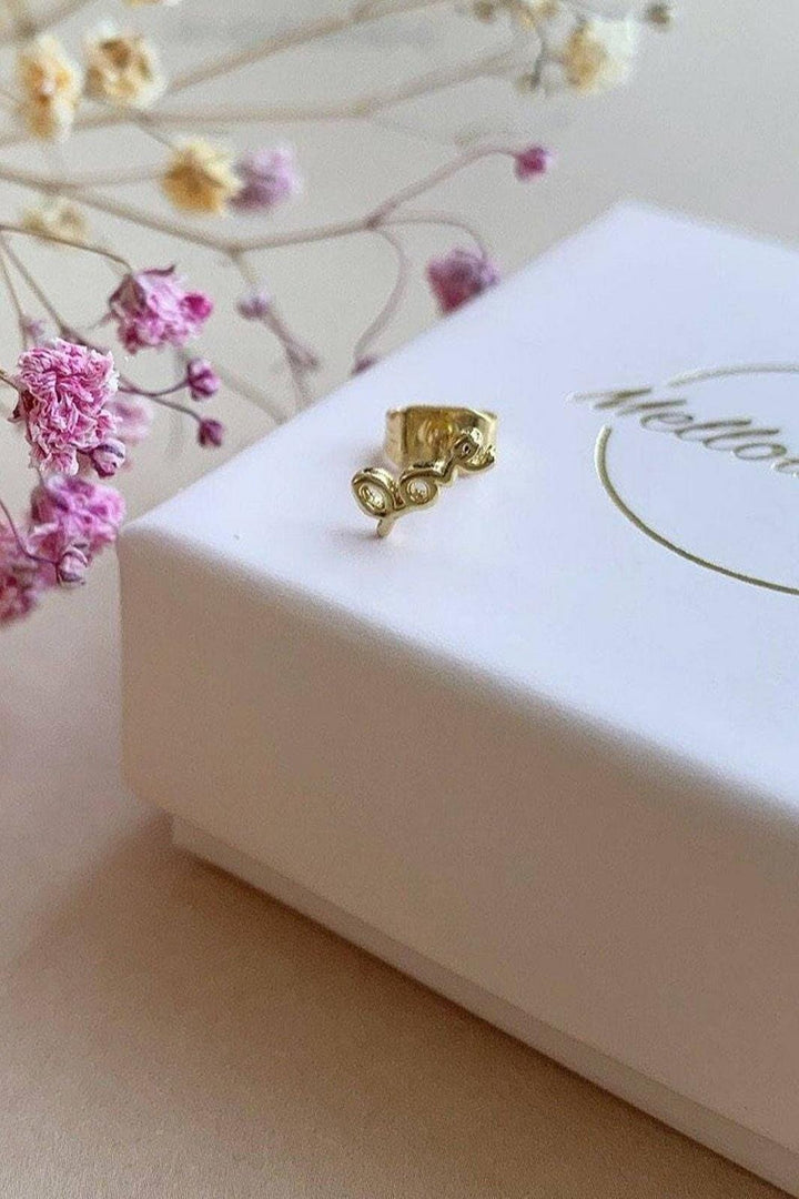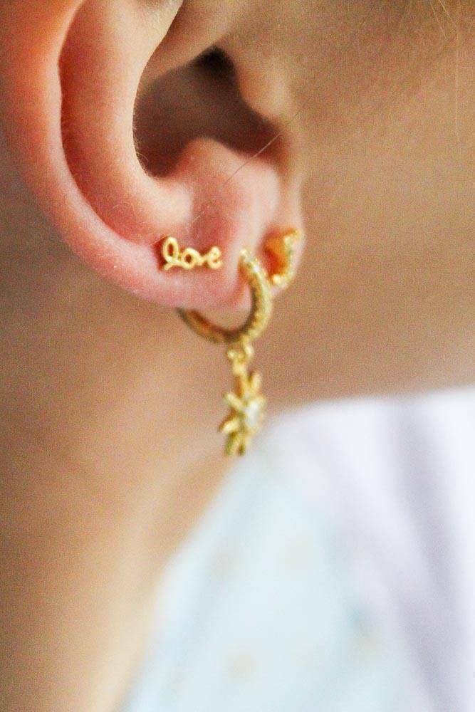 Vergoldeter Ohrring von Mellow Moon mit dem Text love. Der Ohrring hat ein feines Detail in Form der Schrift, die aus 18-karätigem vergoldetem Messing gefertigt ist.