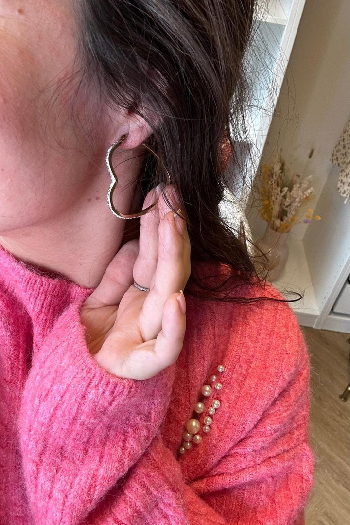 Versilberte Hoops von Mellow Moon in Herzform mit kleinen Steinen entlang des Randes. Die Ohrringe haben eine glänzende Oberfläche und ein einzigartiges Design mit Steinen, die das Licht einfangen.