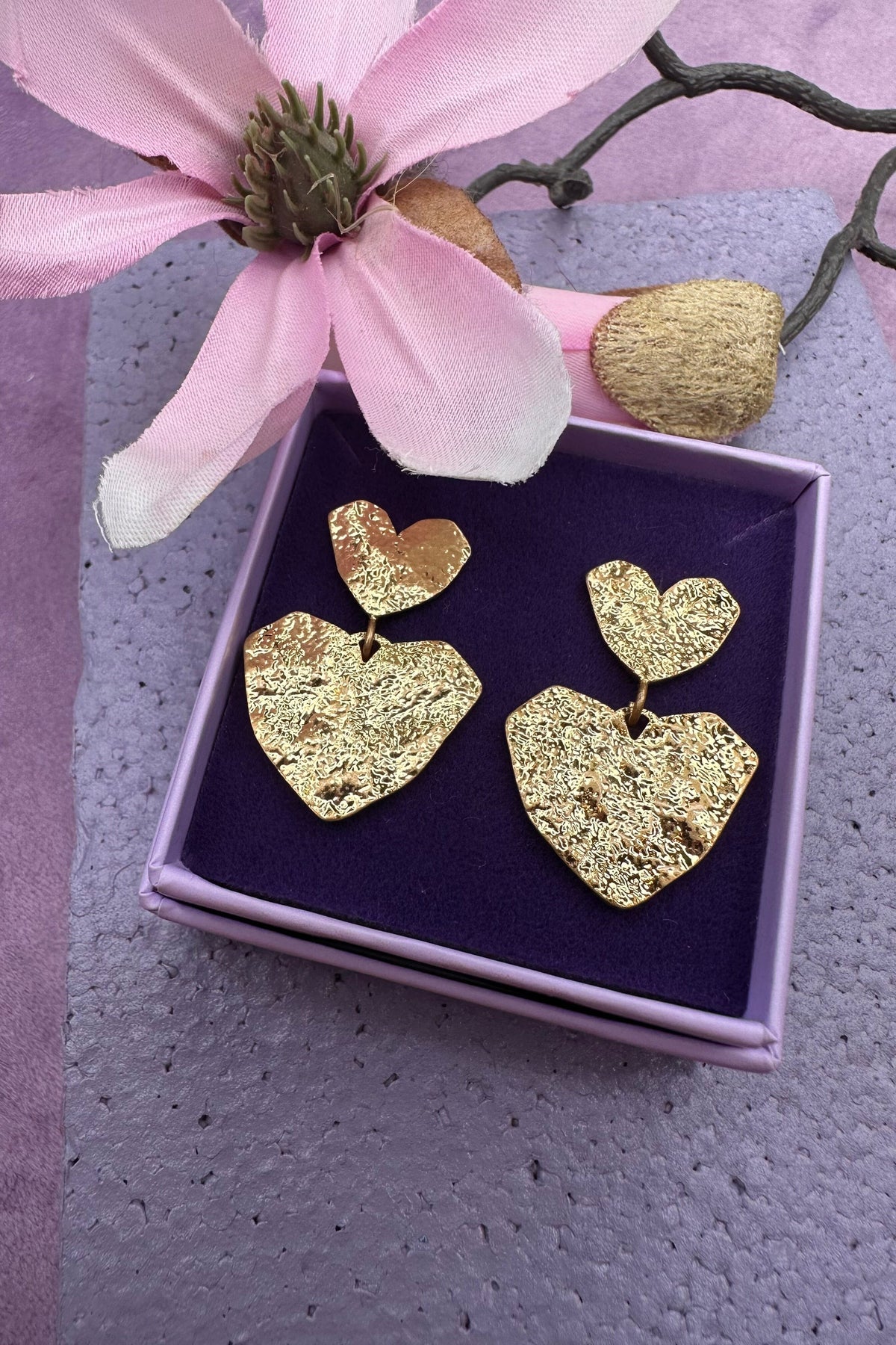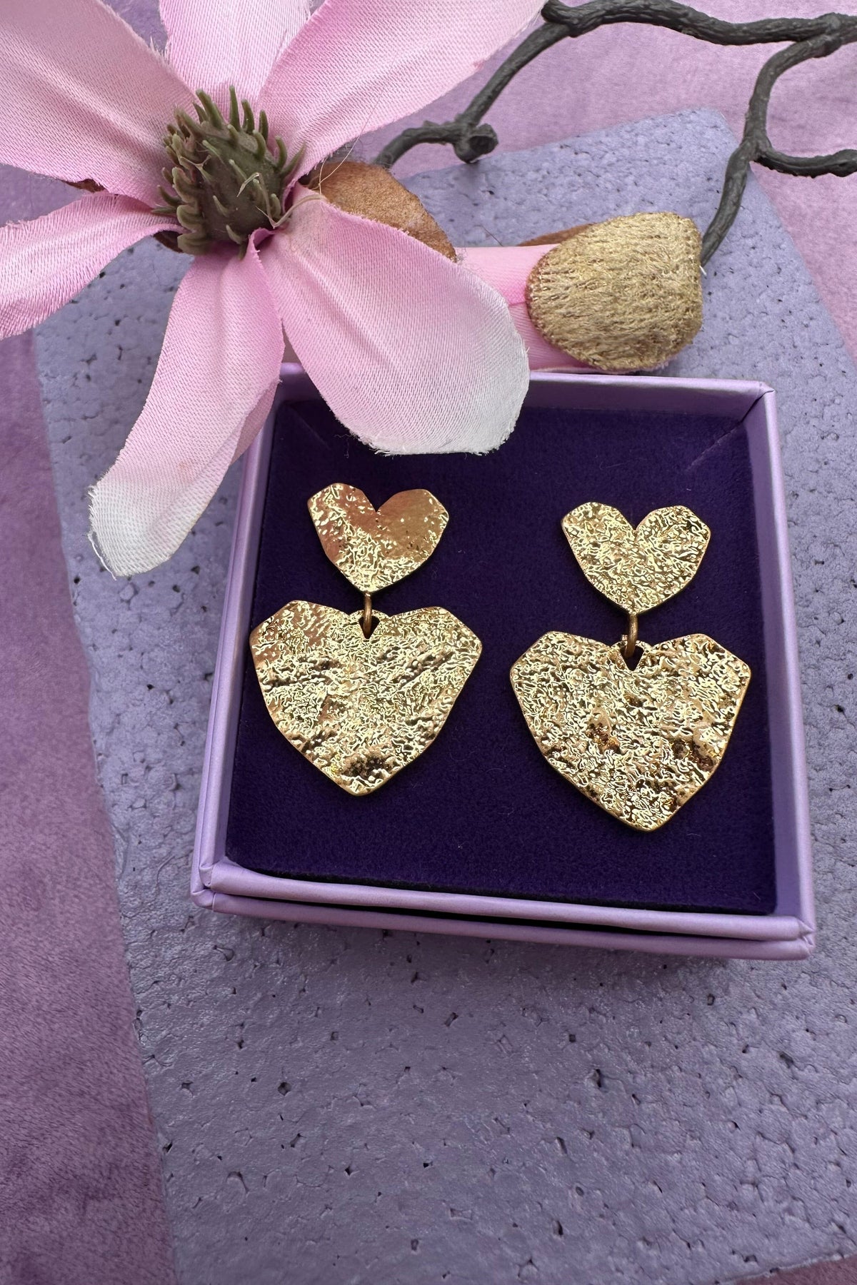 Vergoldete Ohrringe von Mellow Moon mit zwei verbundenen Herzen. Die Ohrringe haben eine strukturierte Oberfläche, die ein schönes Spiel im vergoldeten Messing erzeugt.
