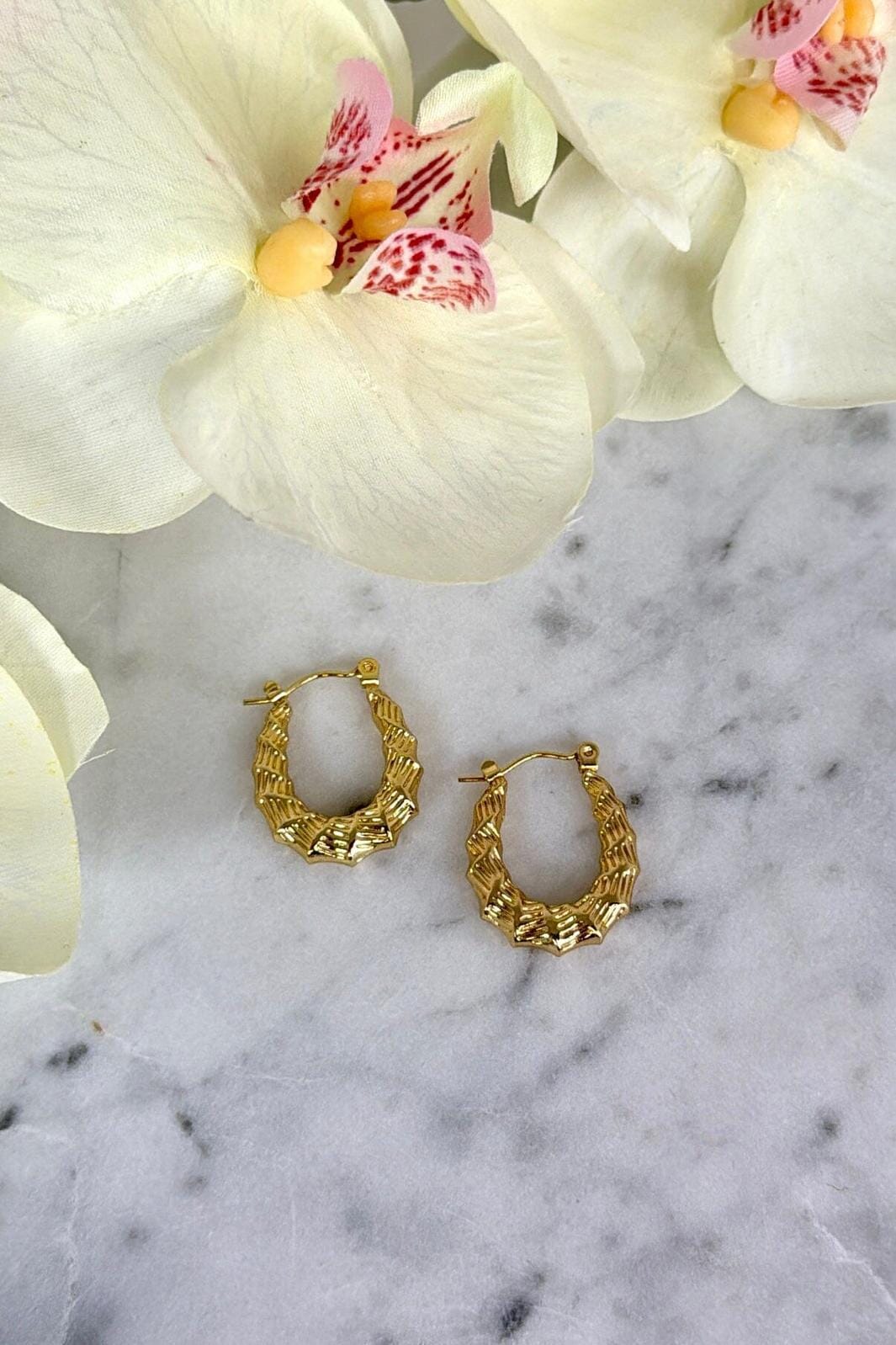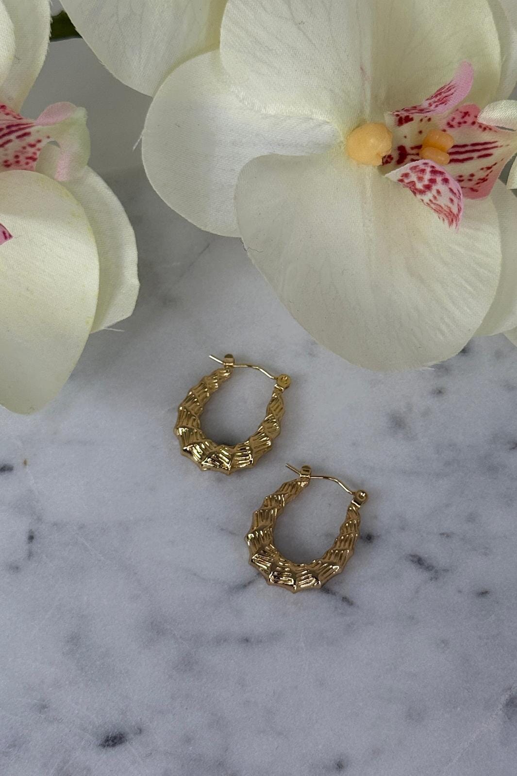 Vergoldete Hoop-Ohrringe von Mellow Moon mit einem wellenförmigen Design. Die Ohrringe haben eine Prägung auf der Oberfläche mit einem charakteristischen Muster im goldenen Metall.