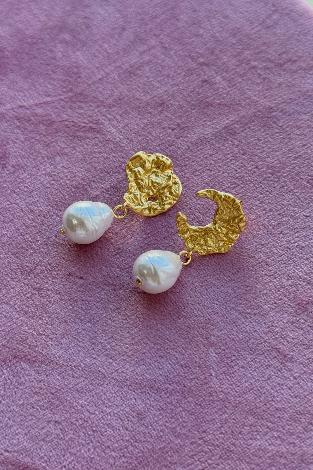 Ohrringe von Mellow Moon mit einer strukturierten Oberfläche in goldener Farbe. Die gewellte Metalloberfläche wird mit weißen Barockperlen am Ende kombiniert.