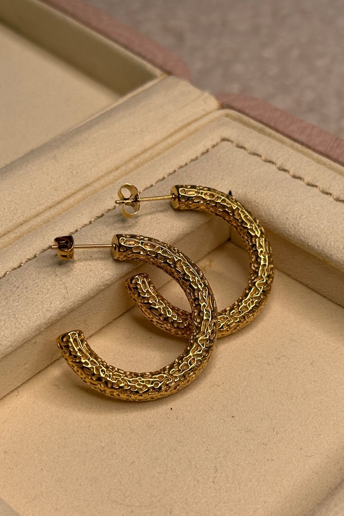 Vergoldete Hoops von Mellow Moon mit einer gepunkteten Oberfläche. Die Ohrringe haben ein klassisches Hoop-Design in mittlerer Größe, das zu vielen verschiedenen Anlässen passt.