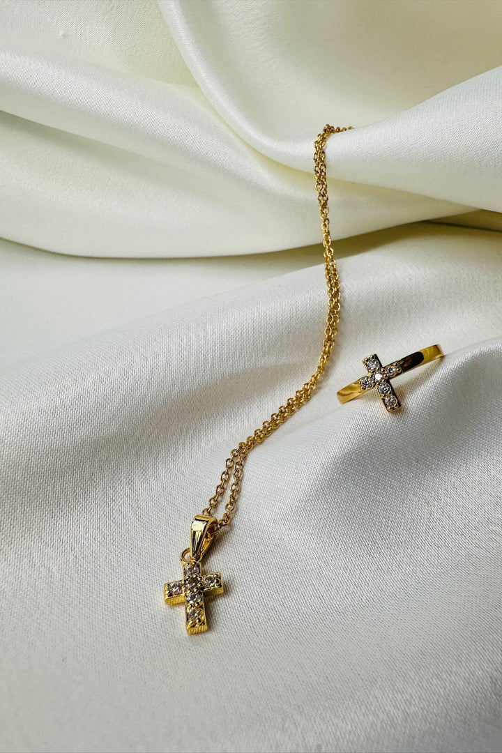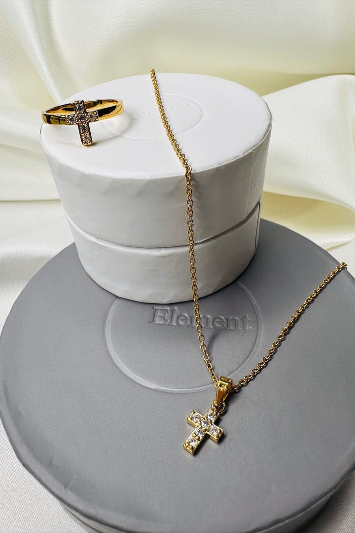 Vergoldete Halskette von Mellow Moon mit einem Kreuzanhänger. Die Kette hat kleine Steine im Kreuz eingesetzt und wird mit einem passenden Ring im gleichen Design geliefert.