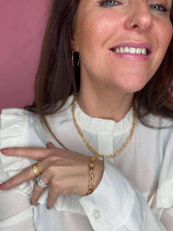 Goldbeschichtete Halskette von Mellow Moon mit verbundenen Gliedern. Die Halskette hat eine glänzende Oberfläche in Gold und ist mit einer 18K Goldbeschichtung hergestellt.