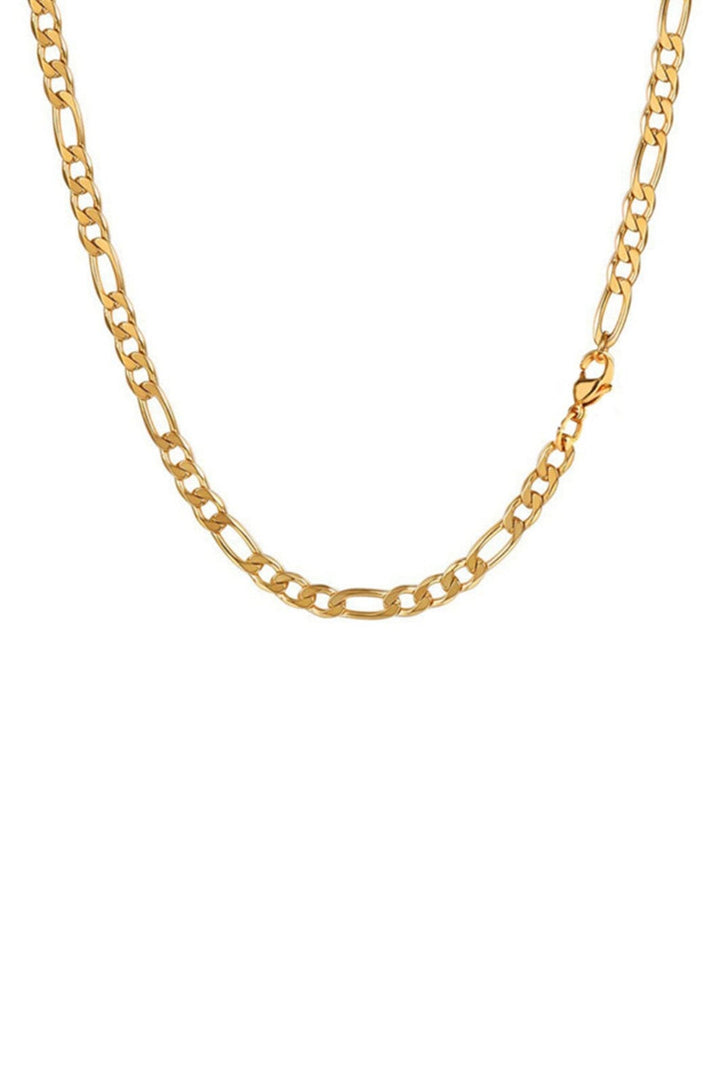 Vergoldete Halskette von Mellow Moon mit Figaro-Kettenmuster aus rostfreiem Stahl. Die Kette hat ein klassisches Design mit wechselnden kurzen und langen Gliedern in einer 1+3-Kombination.