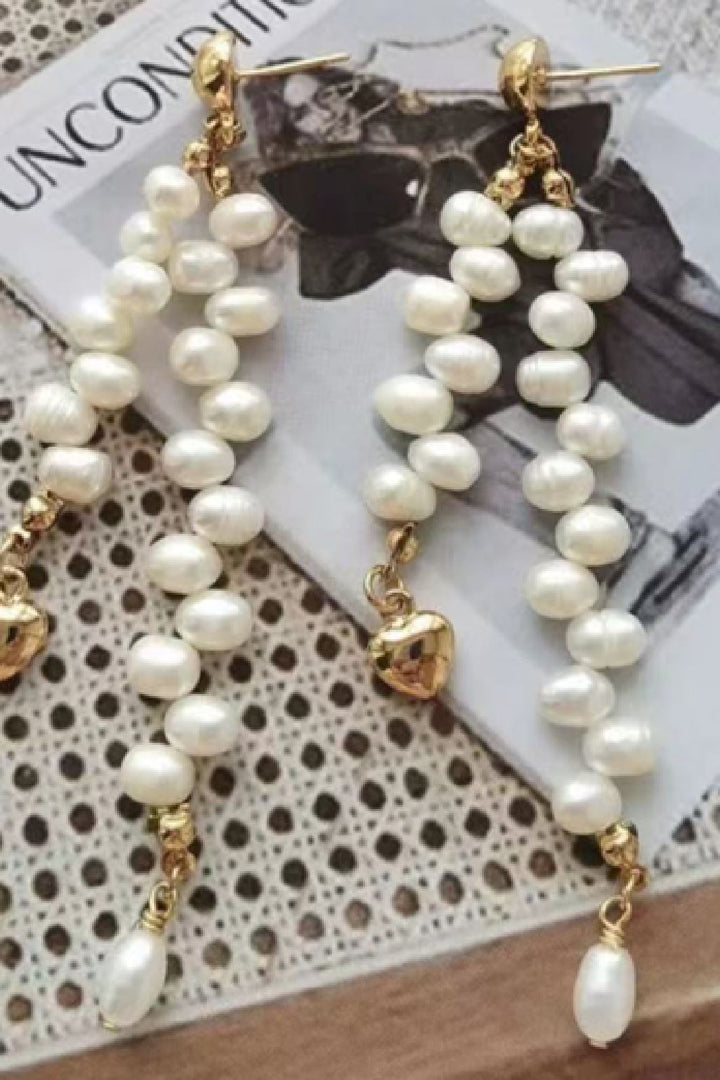 Lange Ohrringe von Mellow Moon mit Süßwasserperlen in Kaskadenform. Die weißen Perlen sind an einer vergoldeten Kette mit einem Herzanhänger am Ende befestigt.