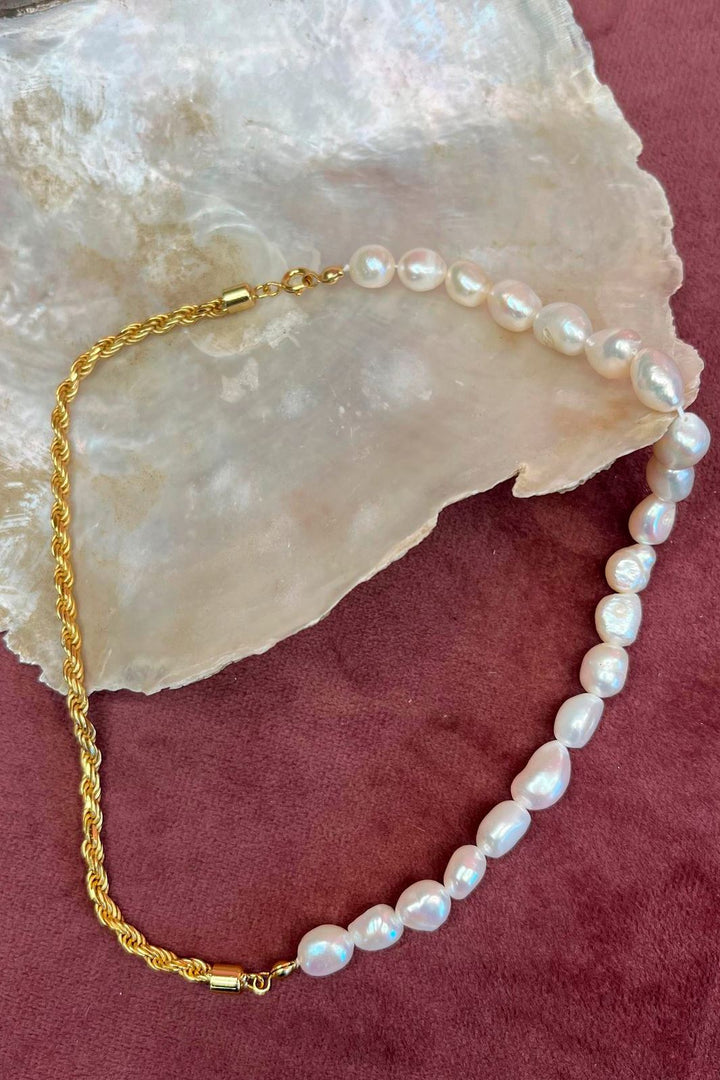 Halskette von Mellow Moon mit Naturperlen und vergoldetem Sterlingsilber. Es hat Perlen auf einer Hälfte und eine Goldkette auf der anderen, und ist komplett nickel- und bleifrei.