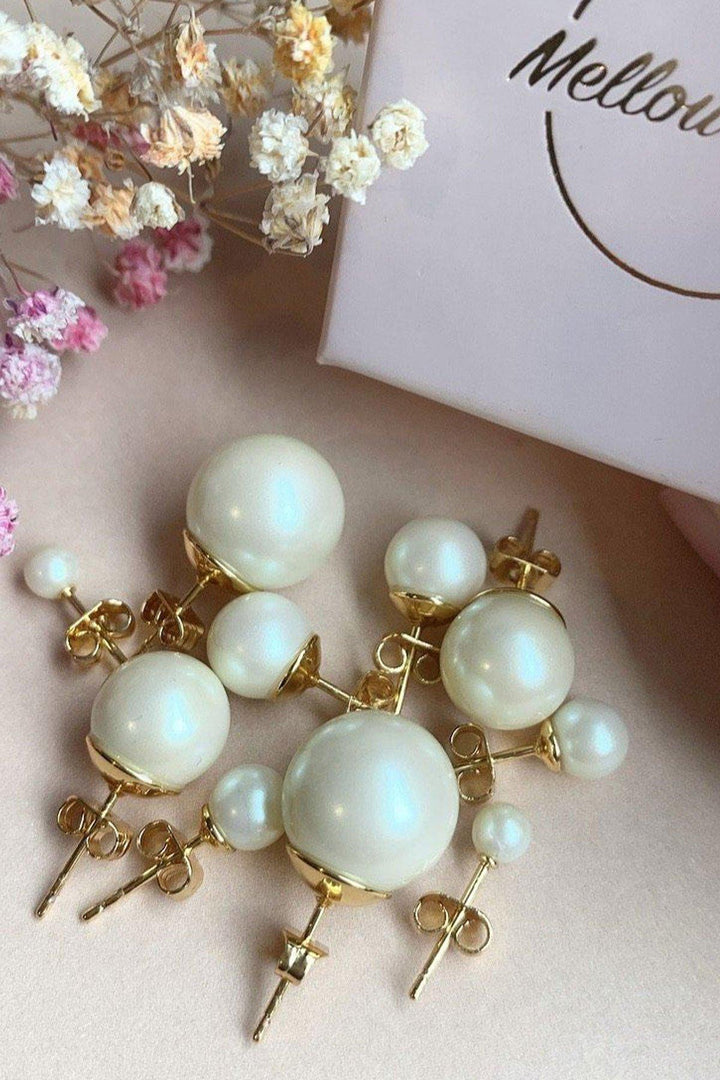 Perlenohrringe von Mellow Moon mit vergoldeter Oberfläche und cremeweißen Glasperlen. Die Ohrringe sind in verschiedenen Perlengrößen von 4 bis 12 Millimetern erhältlich, sodass sie an den individuellen Stil angepasst werden können.