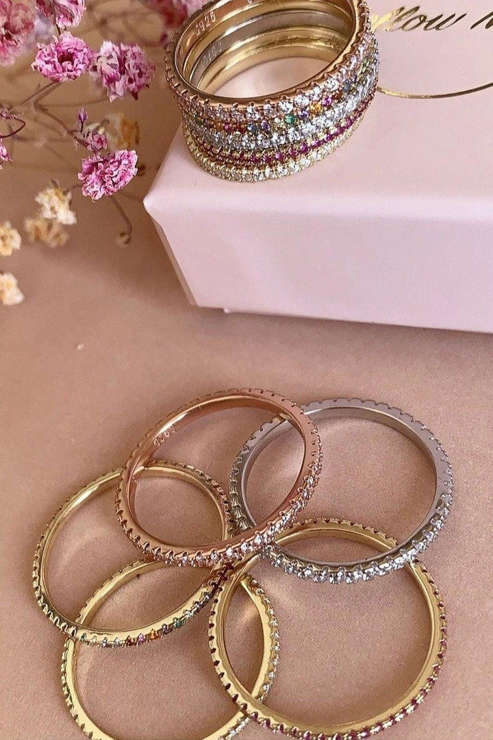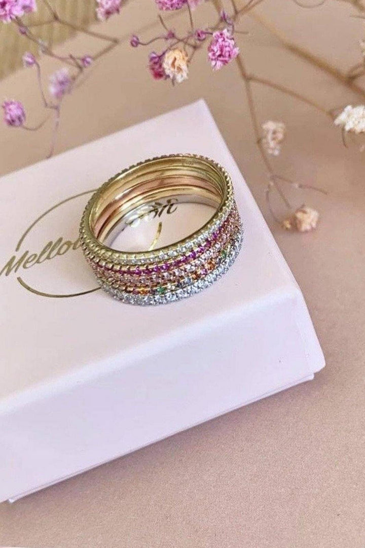 Ringe von Mellow Moon mit bunten Steinen aus vergoldetem und versilbertem Sterlingsilber. Sie können einzeln oder gestapelt getragen werden, um verschiedene Kombinationen zu schaffen.