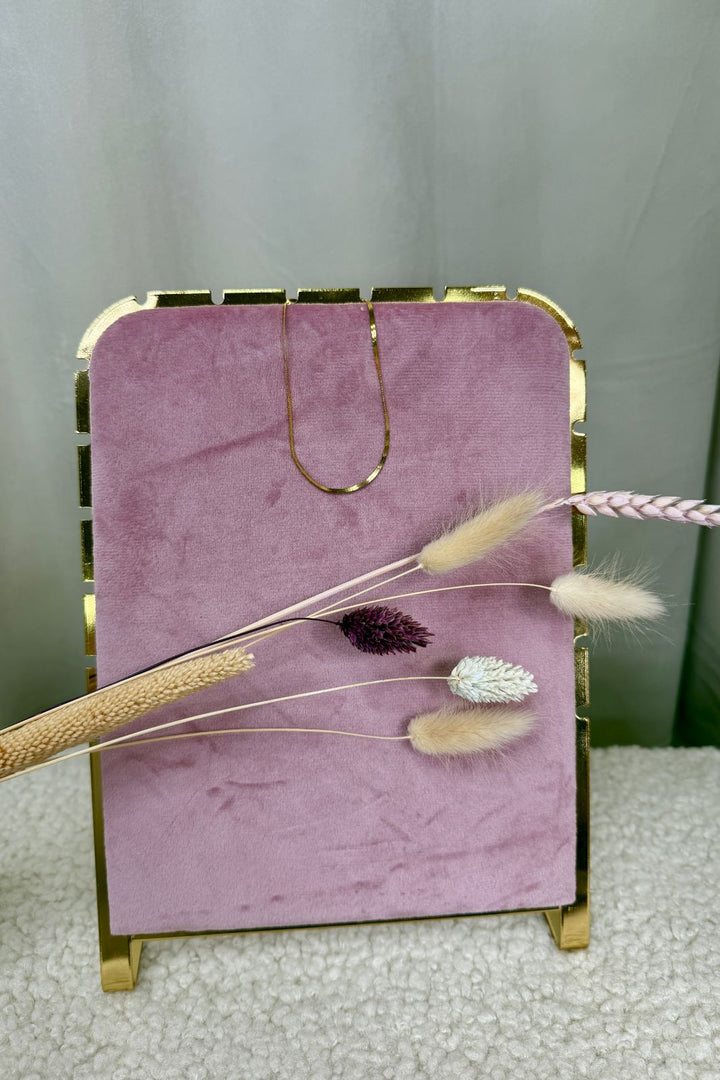 Goldene Halskette von Mellow Moon mit einem schlanken und flachen Design. Die Halskette hat eine glatte Oberfläche aus rostfreiem Stahl mit goldener Oberfläche.