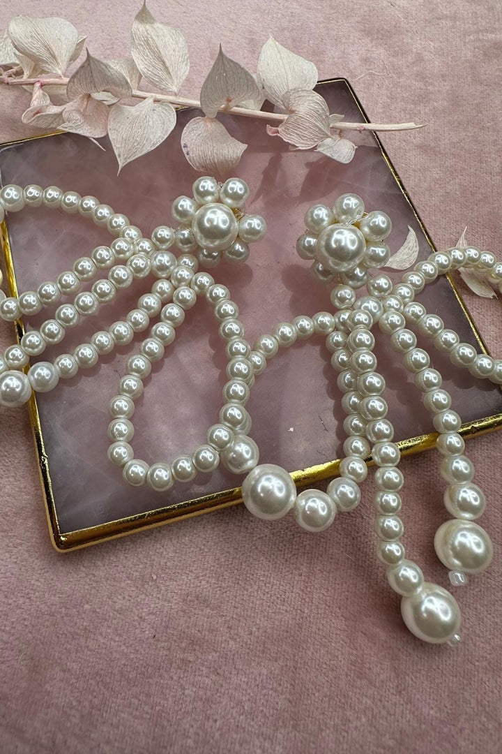 Schleifenohrringe von Mellow Moon mit cremeweißen Perlen in verschiedenen Größen. Die Ohrringe haben ein charakteristisches Schleifendesign mit Perlen, die ein feines Muster bilden.