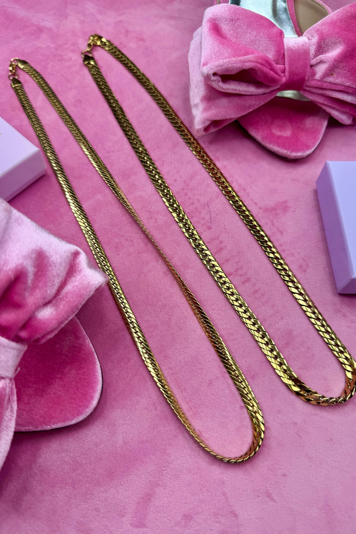 Vergoldete Halskette von Mellow Moon mit Snake Chain-Design. Die glänzende Oberfläche reflektiert das Licht, und die Kette hat ein schlankes, gedrehtes Muster über die gesamte Länge.