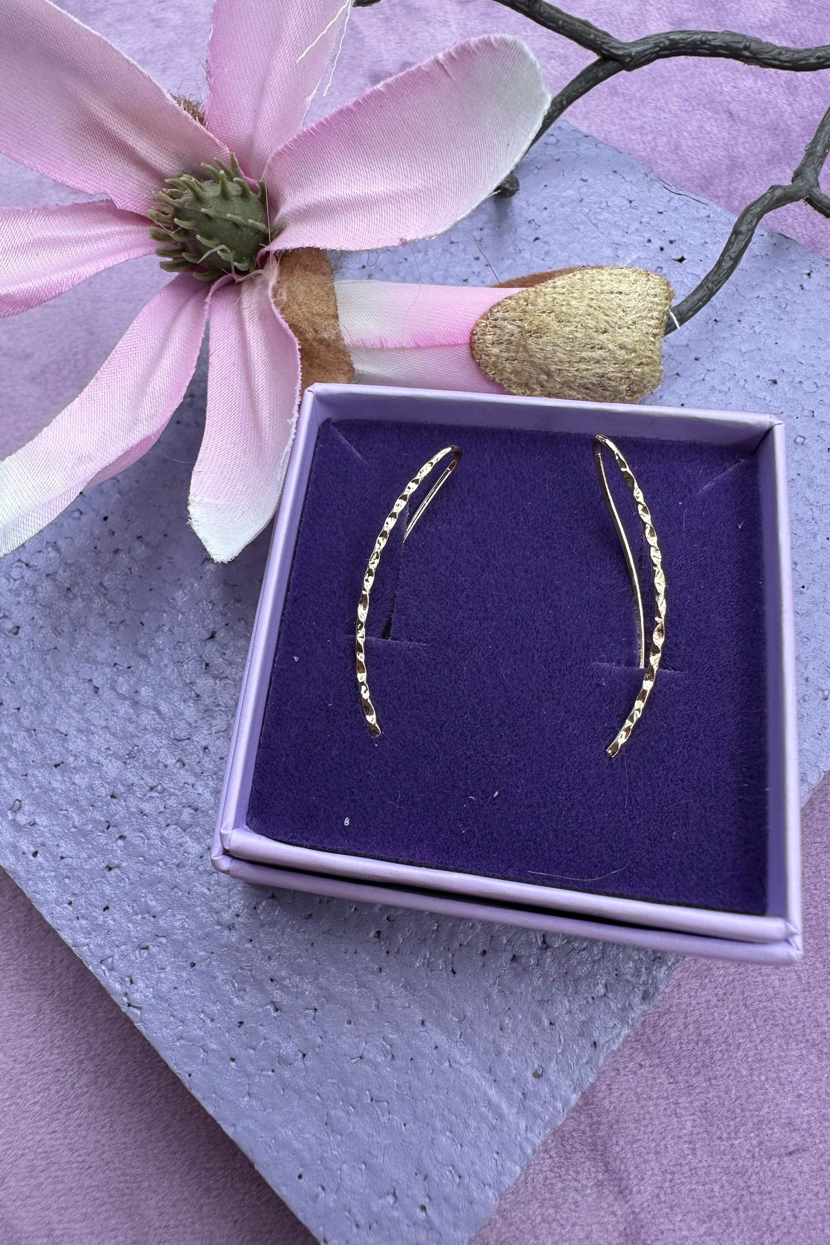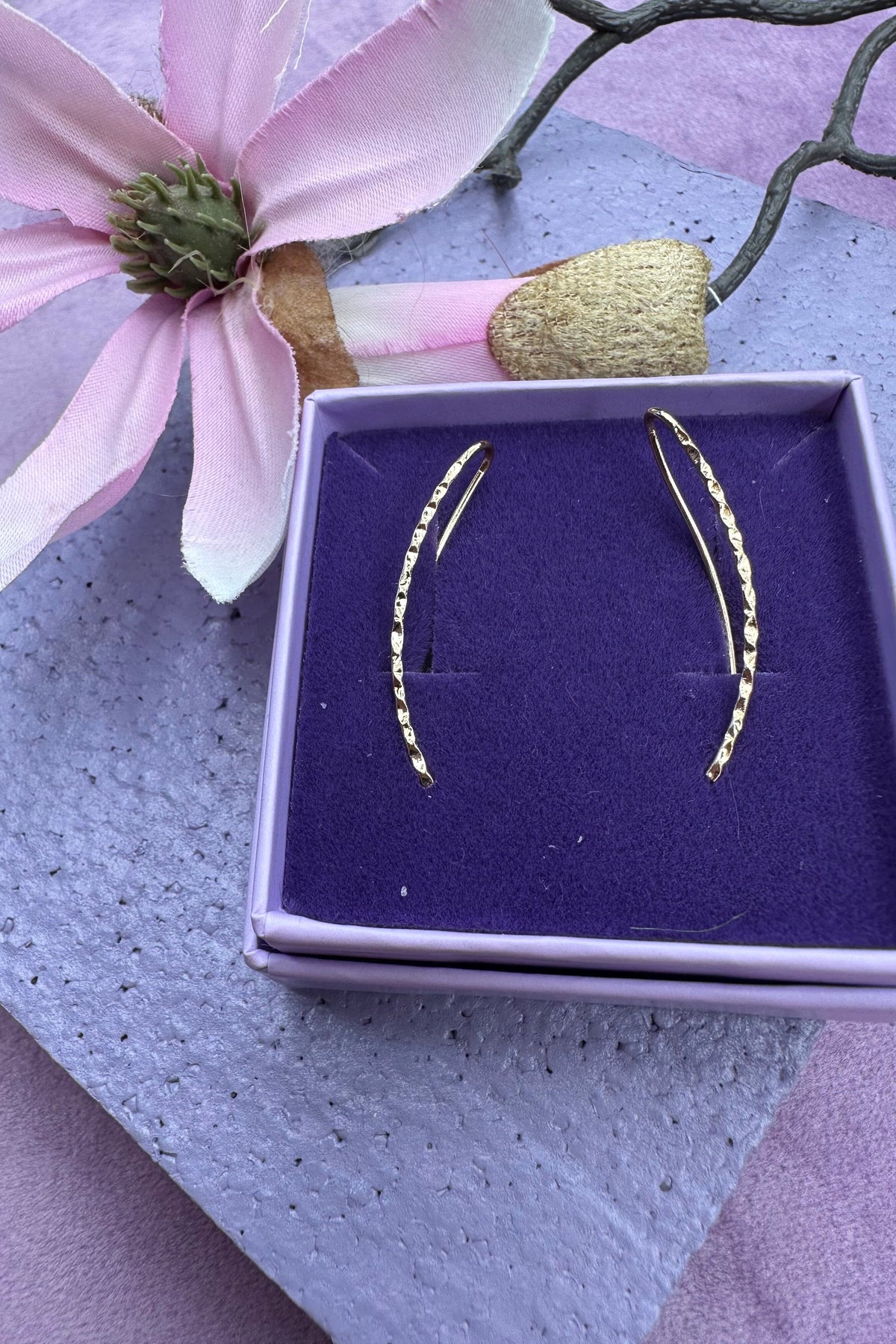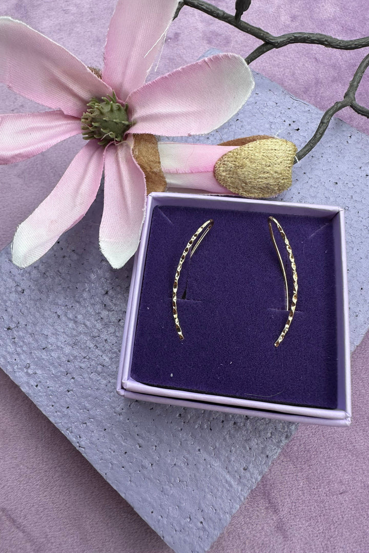 Vergoldete Ohrringe von Mellow Moon mit gedrehter Textur. Die Ohrringe folgen der natürlichen Form des Ohrs und haben ein charakteristisches Design mit strukturierter Oberfläche.