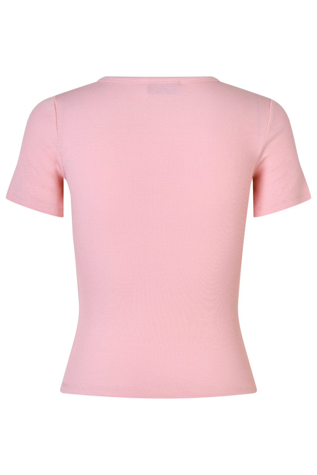Rosa T-Shirt von Modström aus weichem Baumwollrib. Die T-Shirt hat eine figurbetonte Passform mit kurzen Ärmeln und Rundhalsausschnitt. Die Farbe Bubble Pink verleiht einen sanften Ausdruck.