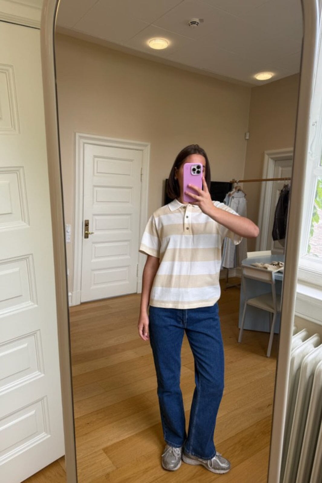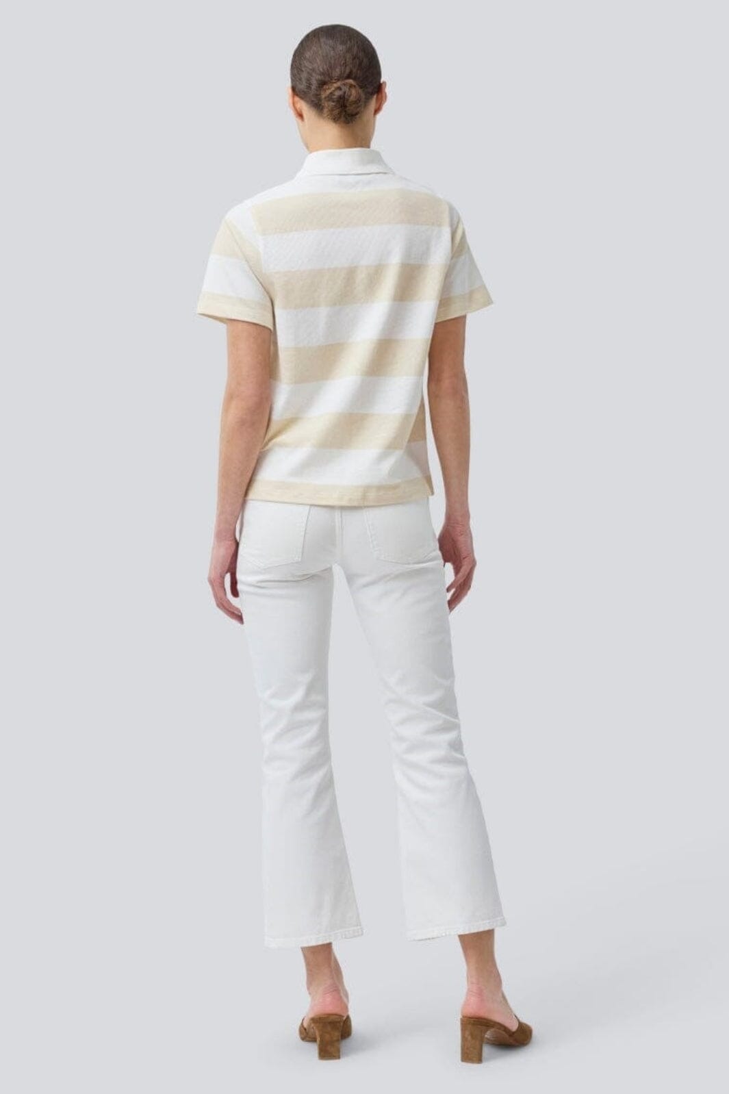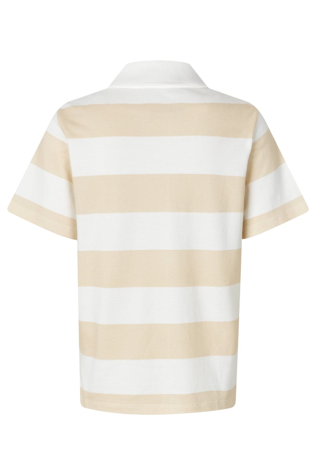 Gestreifte Polo von Modström in Beige und weißen Streifen. Sie hat einen klassischen Polokragen mit Knopfleiste und kurzen Ärmeln. Das gestickte Logo verleiht einen dezenten Akzent.