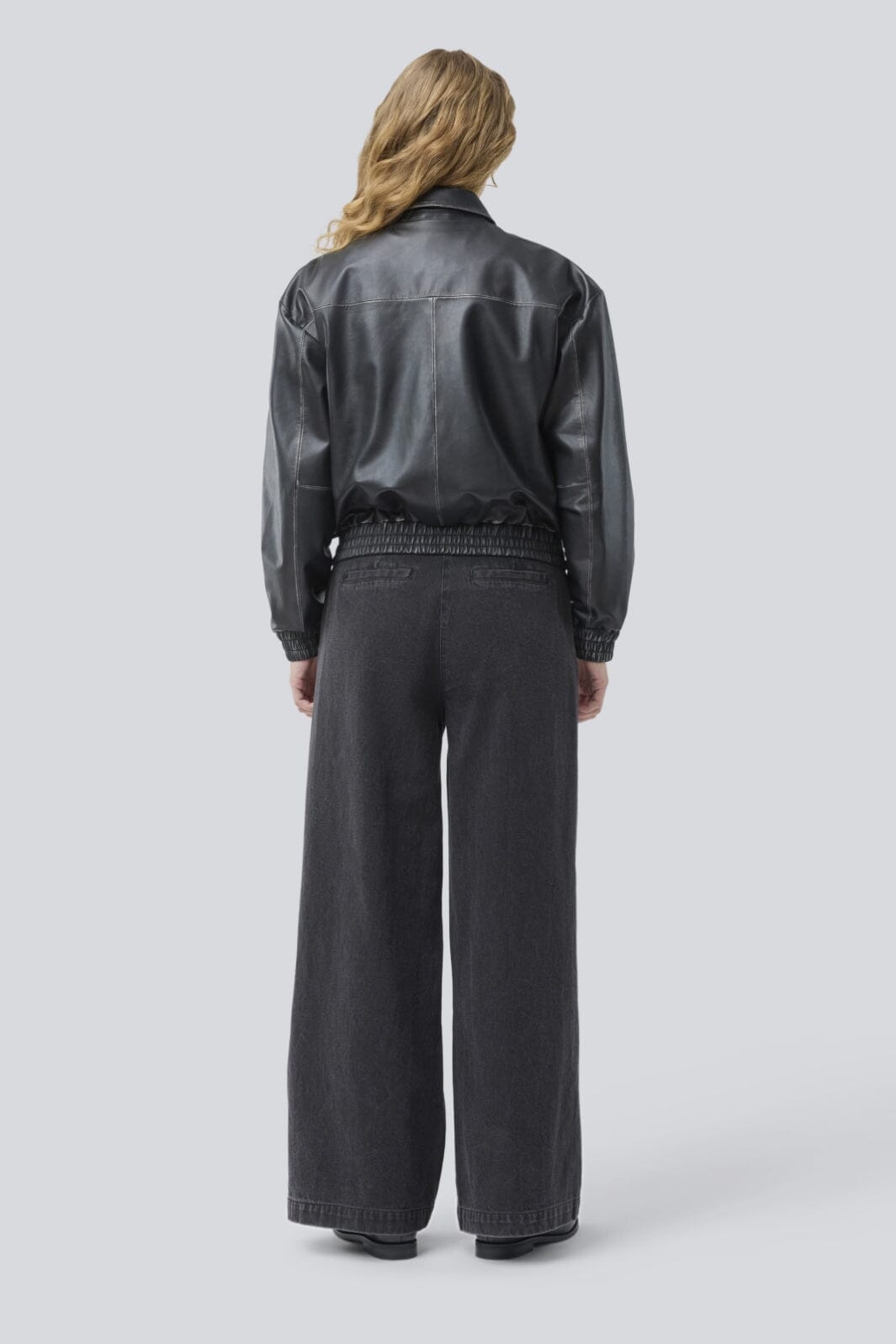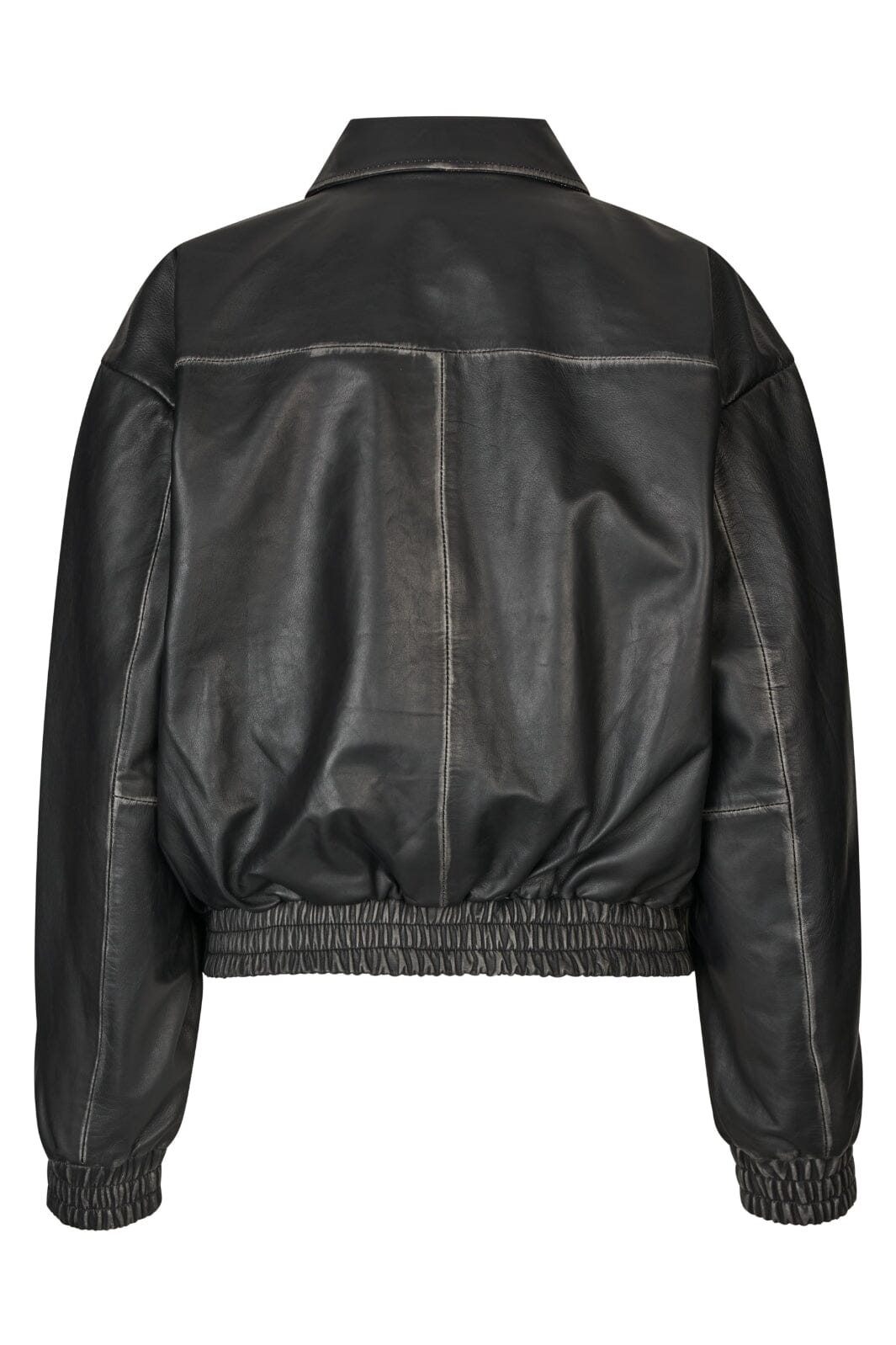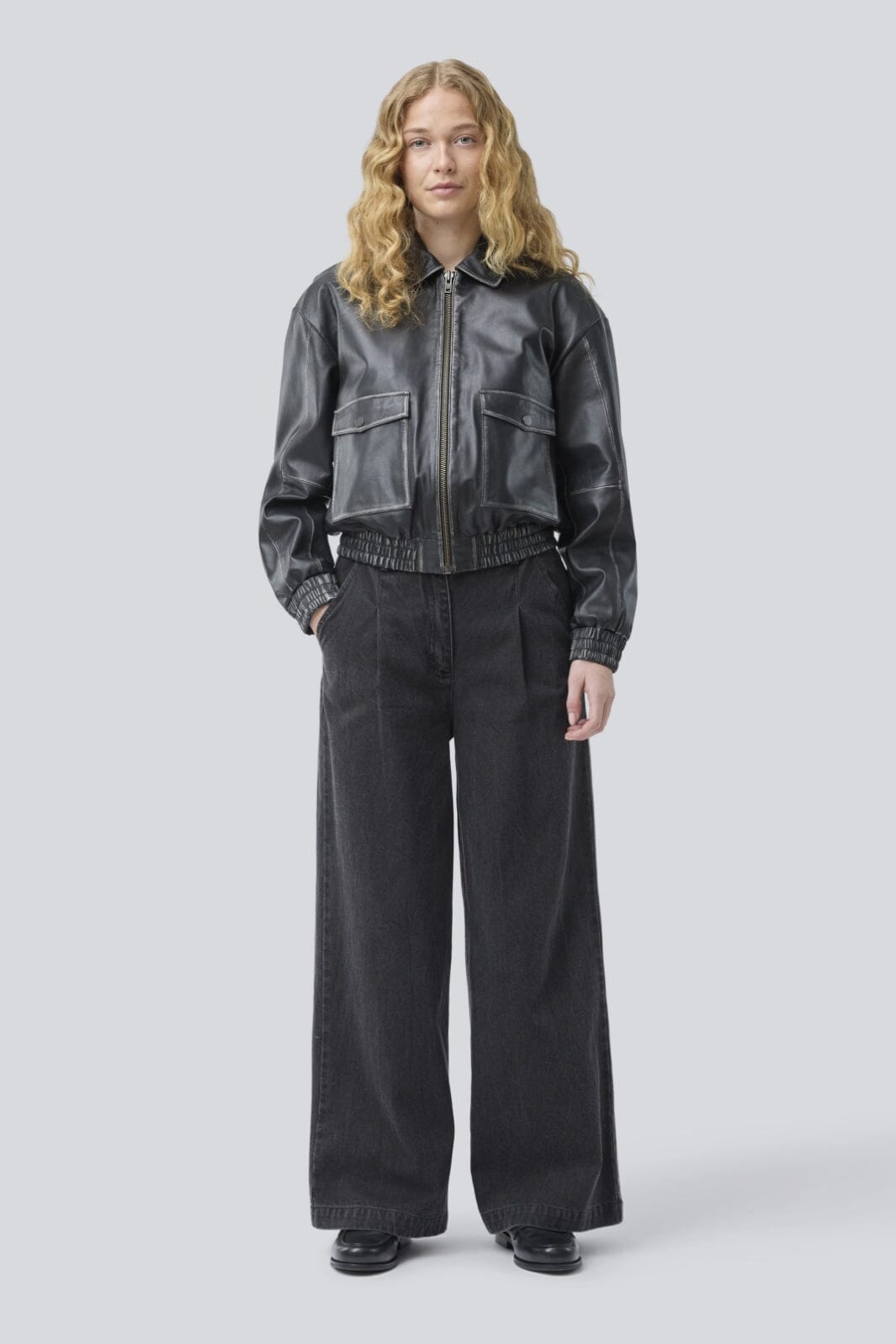 Schwarze Lederjacke von Modström mit Hemdkragen und Frontreißverschluss. Die Jacke hat eine oversized Passform und zwei große Vordertaschen mit Knopfverschluss auf der Vorderseite.