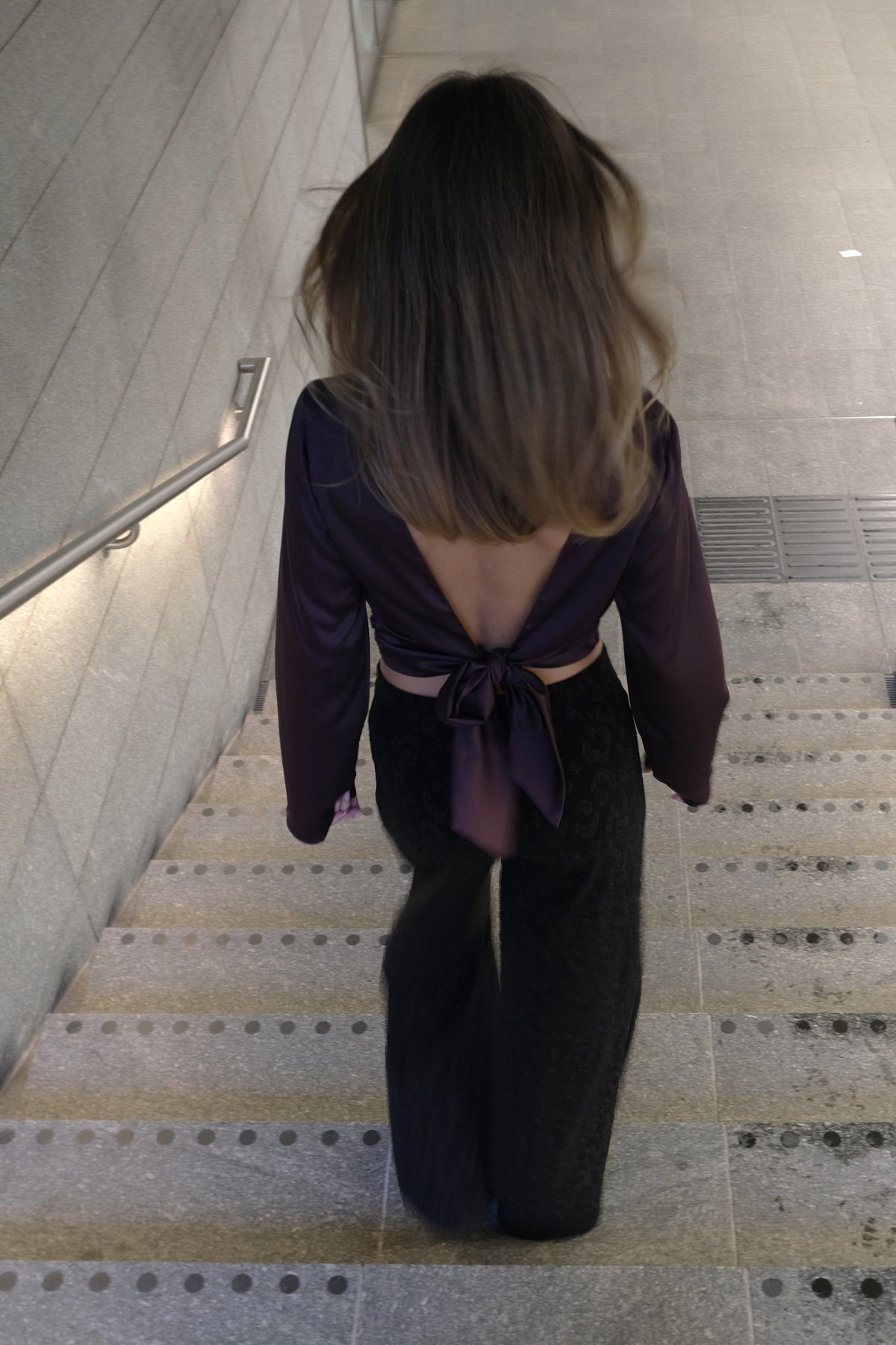 Langärmliges Oberteil von Modström in tiefem lila Satin. Das Oberteil hat einen runden Halsausschnitt vorne, einen tiefen V-Ausschnitt am Rücken und ein Knotendetail, das für einen besonderen Look sorgt.