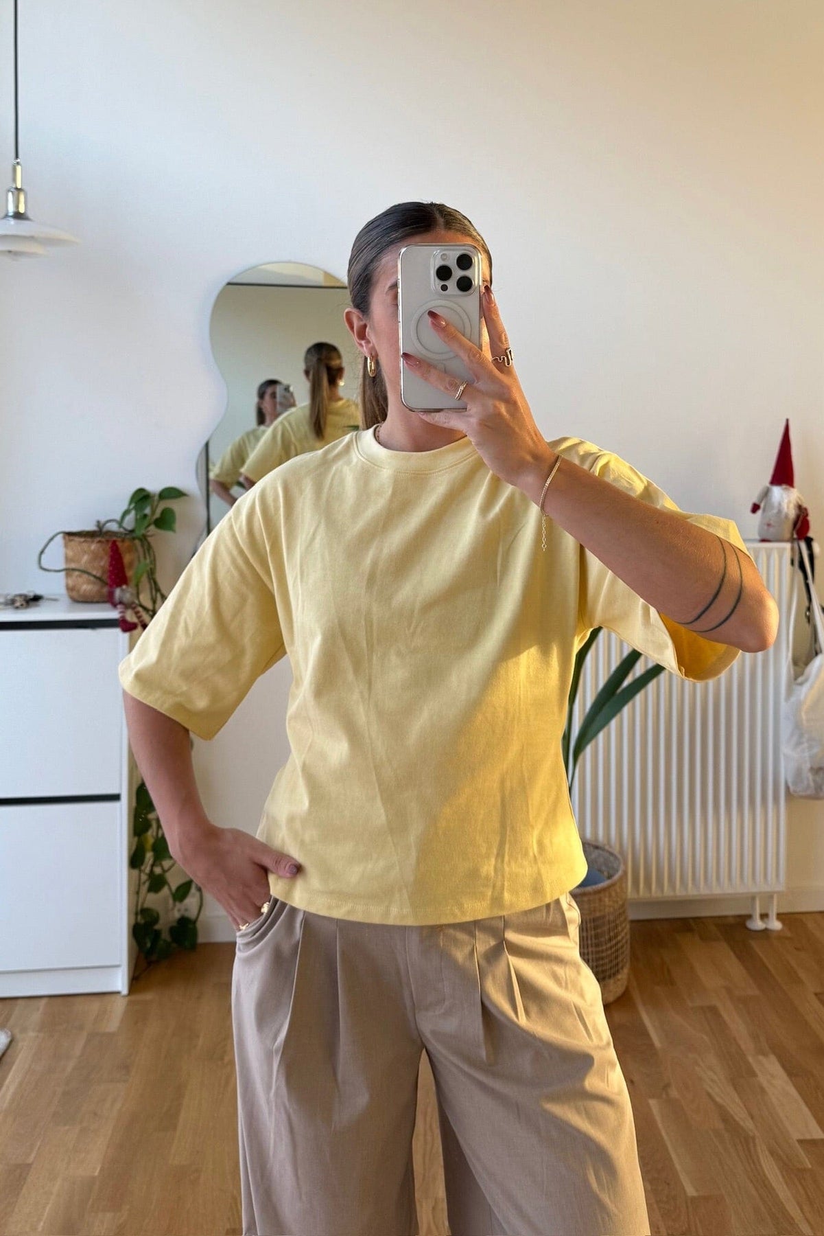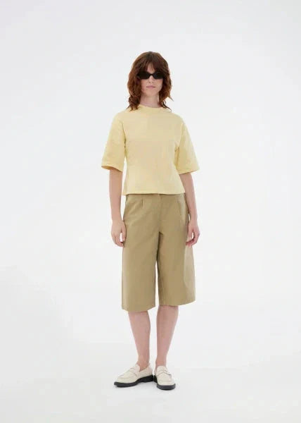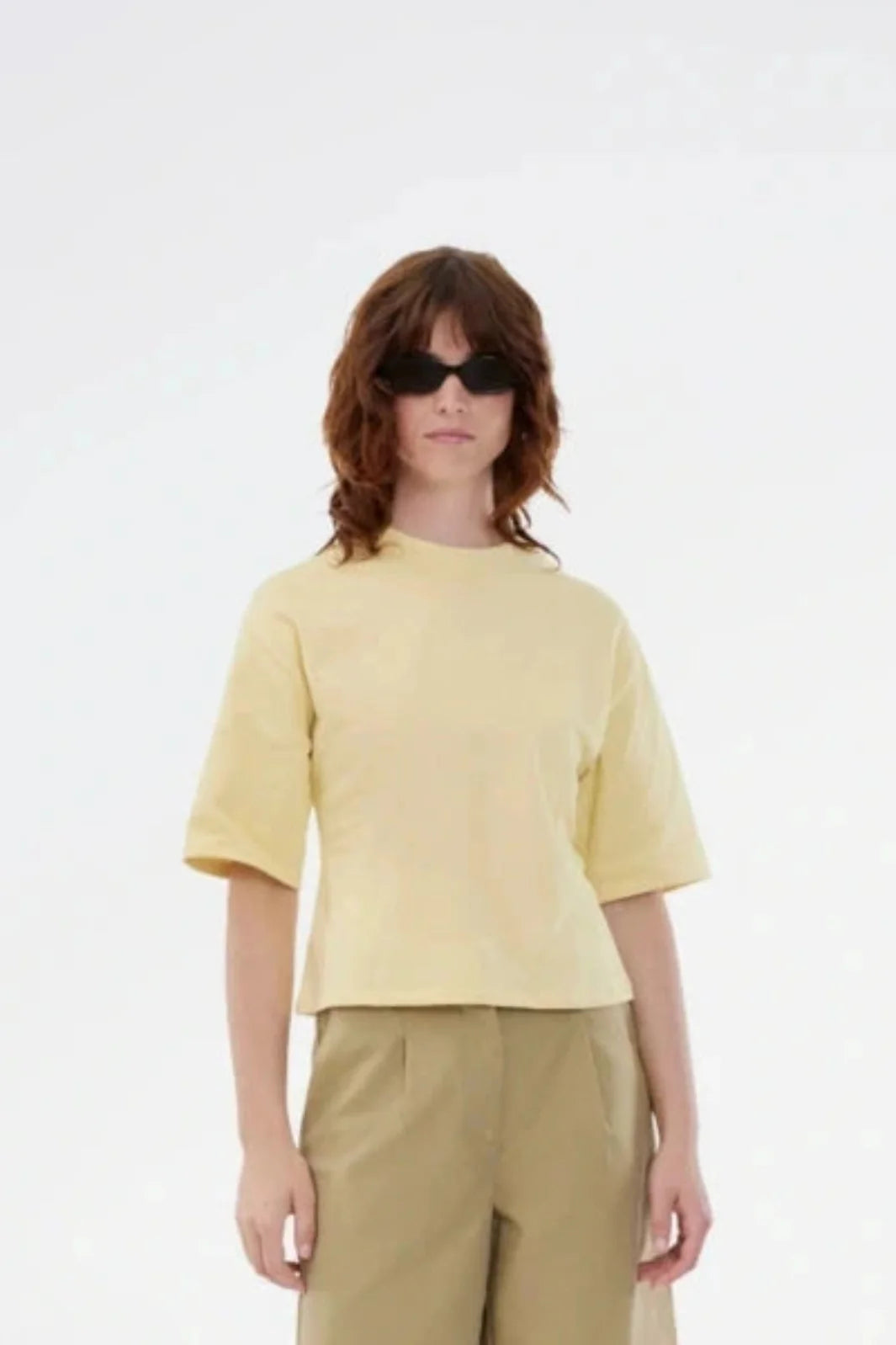 Ein hellgelbes T-Shirt von Modström aus 100 % Bio-Baumwolle. Das T-Shirt ist leicht cropped und hat eine figurbetonte Passform.
