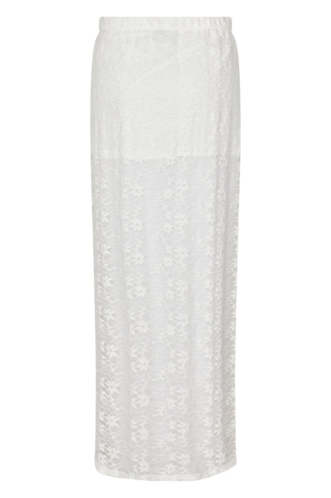 Langer weißer Rock von Modström mit Spitzenmuster und Blumenmotiv. Der Rock hat ein eingearbeitetes Futter und einen teilweise transparenten Saum, der einen sanften Ausdruck verleiht.