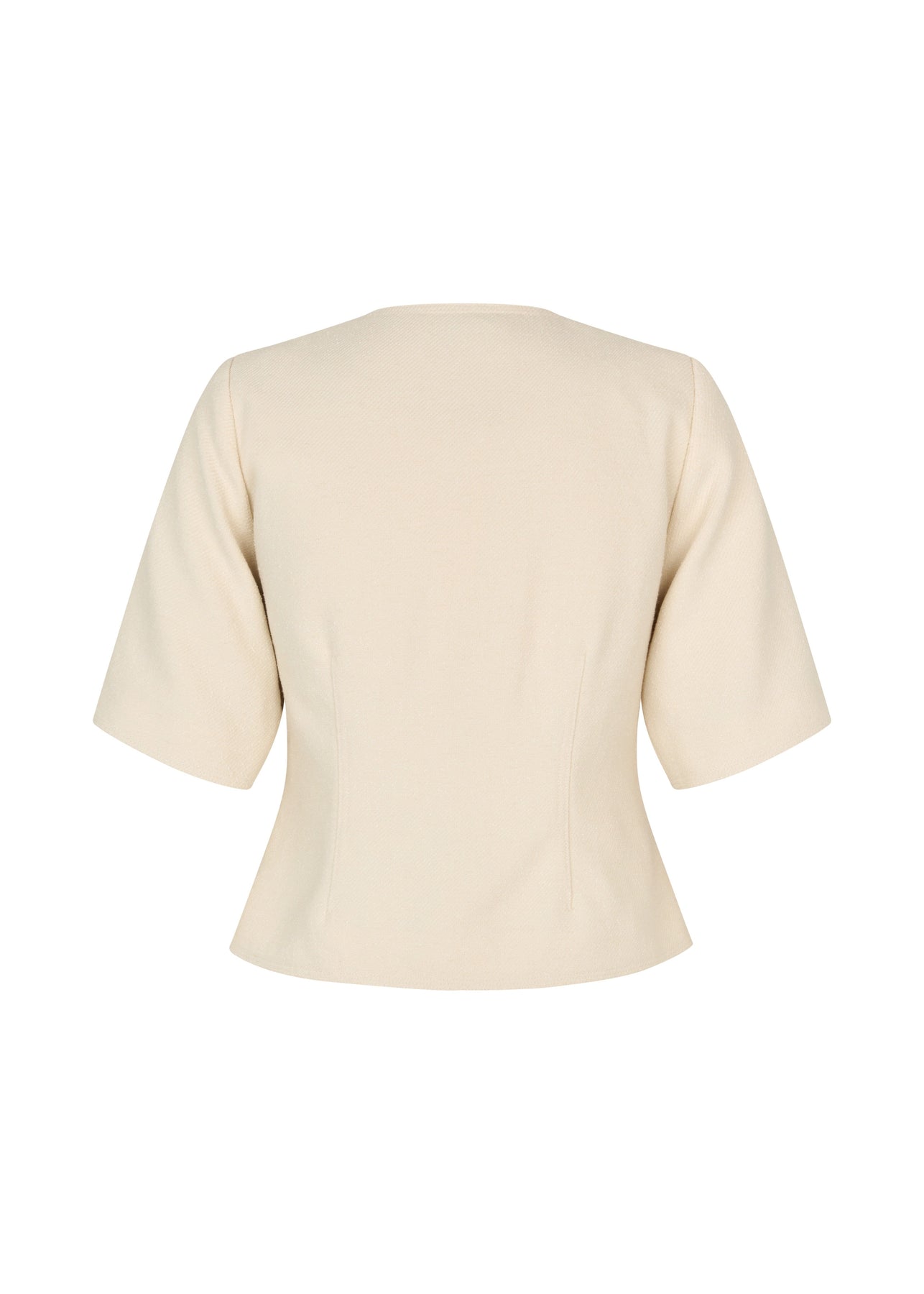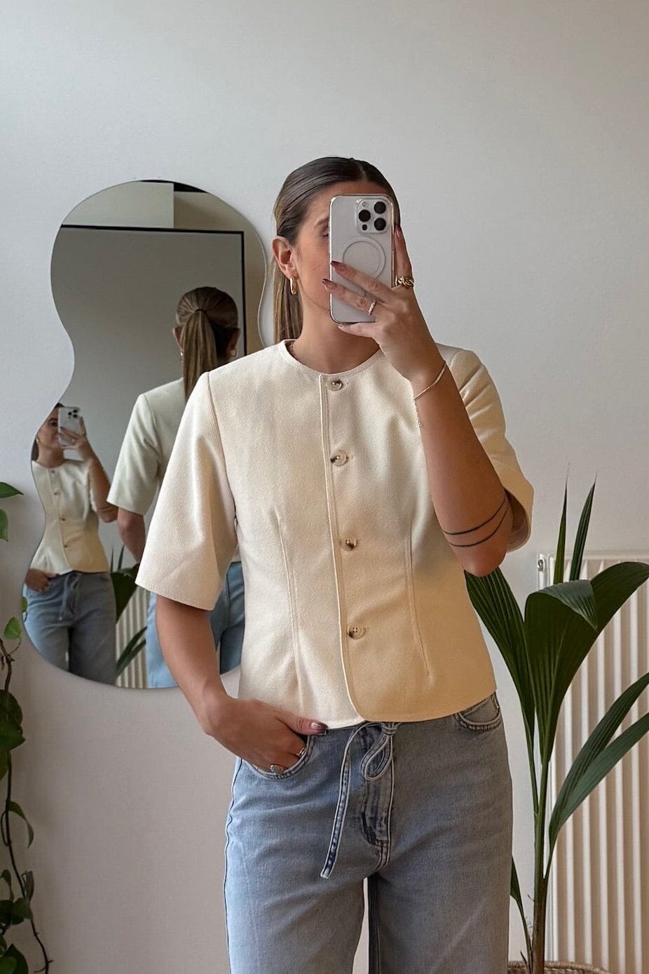 Kurzärmeliger Blazer von Modström in der Farbe Vanilla Cream. Der Blazer hat einen runden Halsausschnitt und wird vorne mit Knöpfen geschlossen.