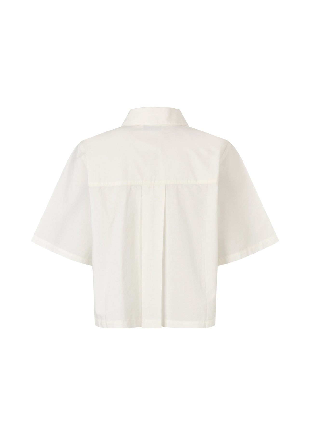 Weißes Hemd von Modström, gefertigt aus 100 % Bio-Baumwolle. Das Hemd hat einen klassischen Kragen, eine Knopfleiste, kurze Ärmel und eine Brusttasche.