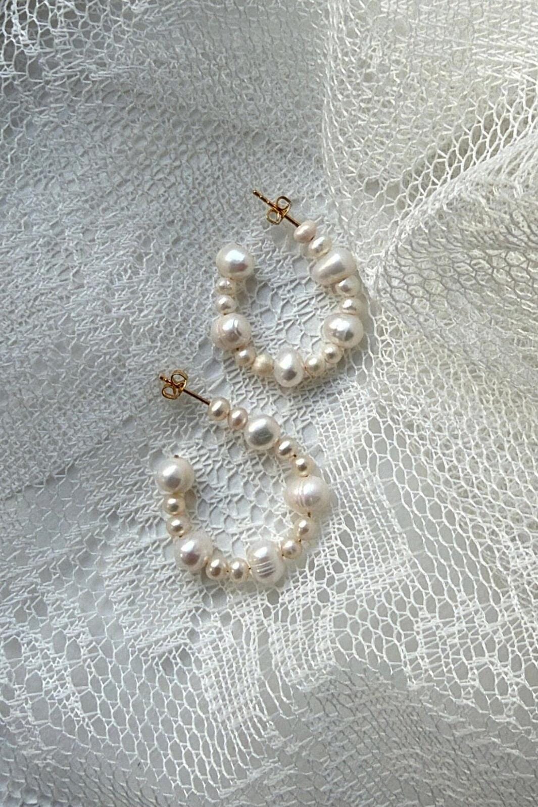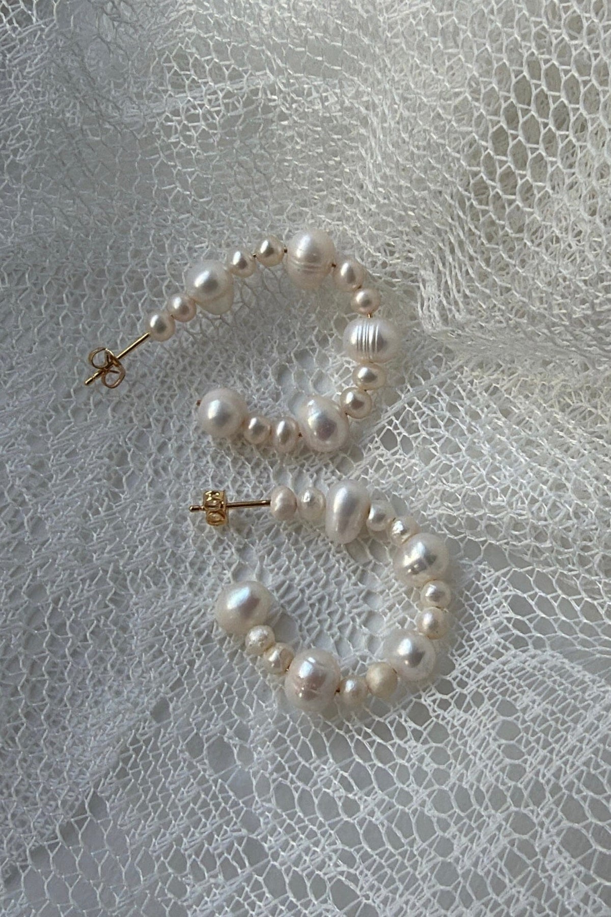 Creolen von Molly&My Jewellery mit weißen Süßwasserperlen in verschiedenen Größen und Formen. Die Creolen bestehen aus Muscheln mit goldfarbenen Steckern.