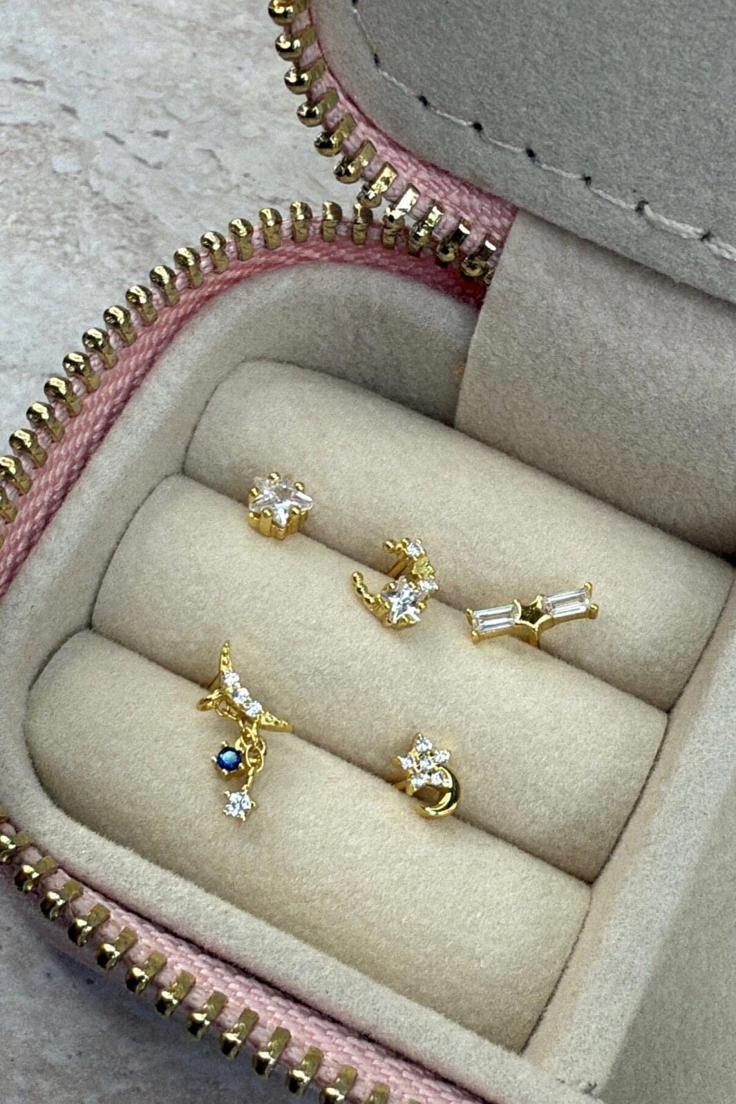 Ohrringe von Molly&My Jewellery aus Edelstahl mit einer vergoldeten Silberoberfläche. Der Schmuck hat goldene Details und Steine in verschiedenen Formen.