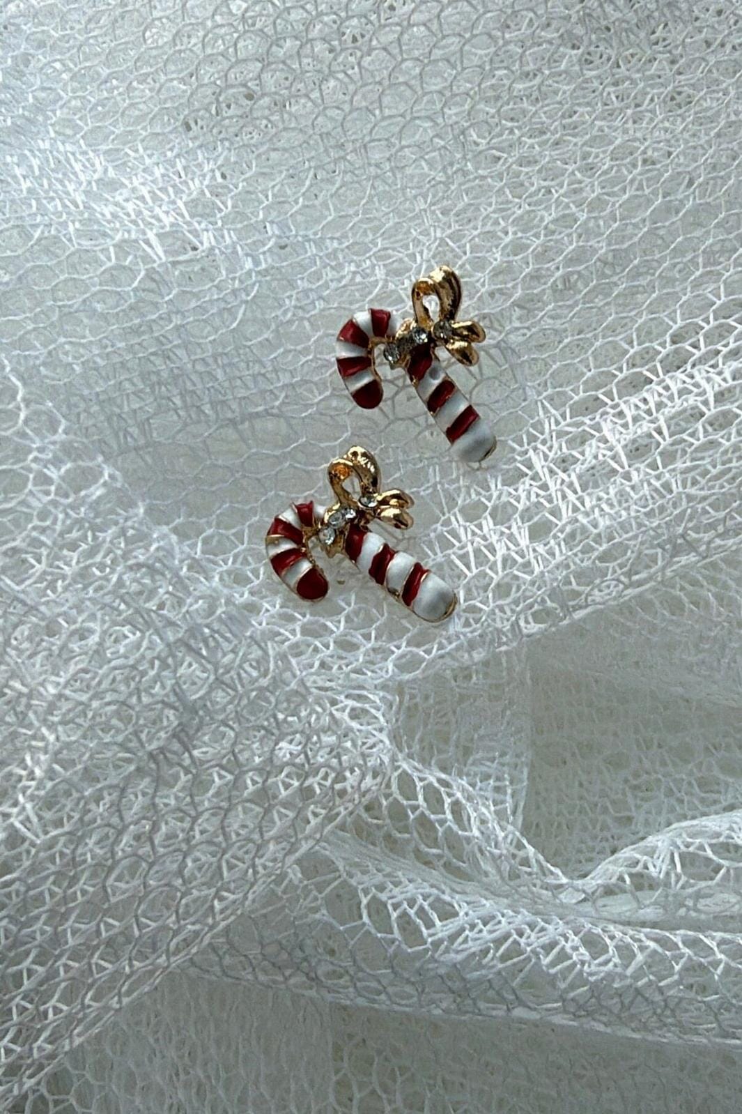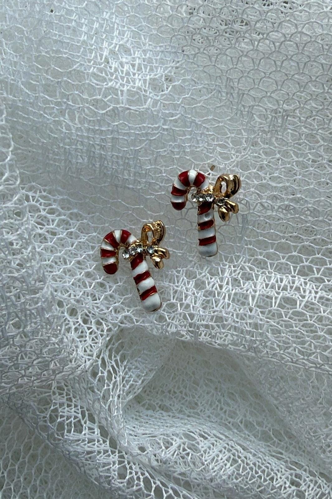 Ohrringe von Molly&My Jewellery, gestaltet wie Zuckerstangen mit roten und weißen Streifen. Sie haben eine kleine goldfarbene Schleife und einen klaren Stein.