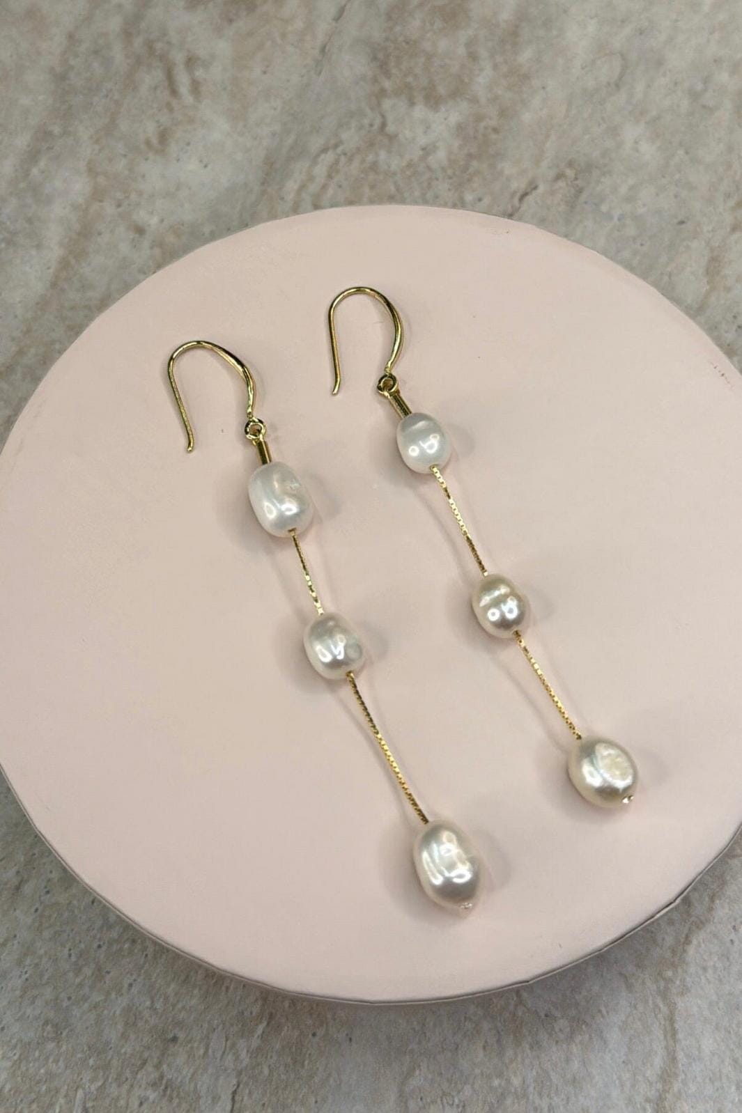 Ohrringe von Molly&My Jewellery mit drei weißen, ovalen Süßwasserperlen, die jeweils mit einer dünnen, goldfarbenen Kette verbunden sind.