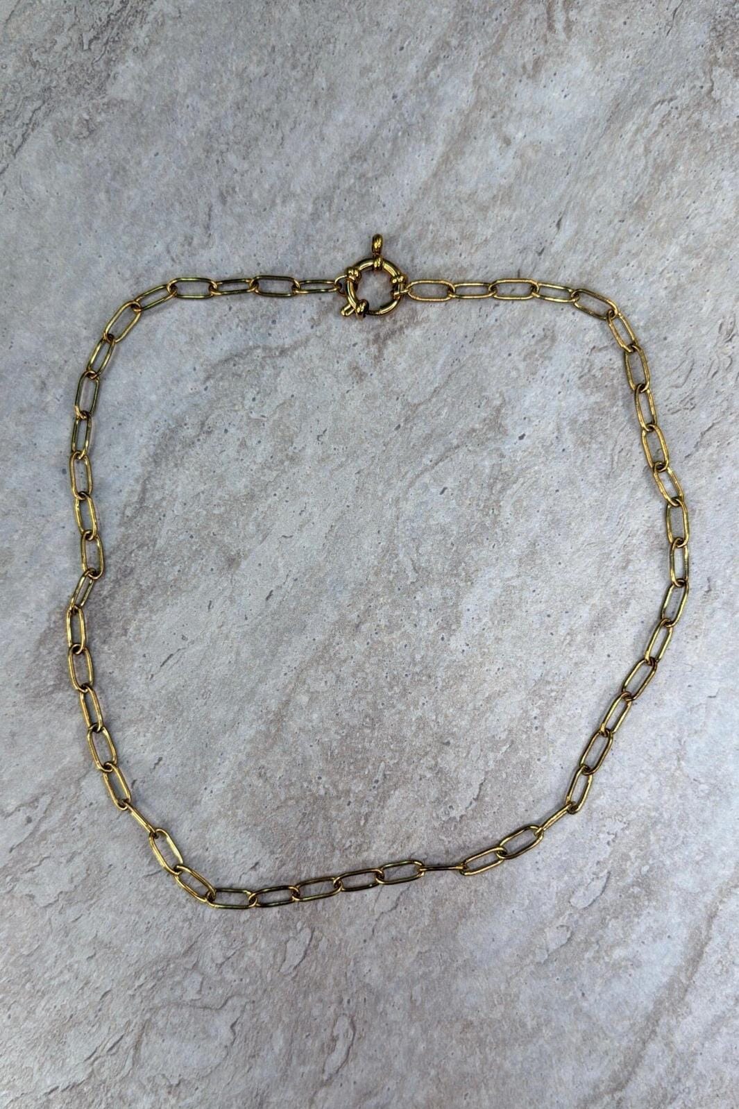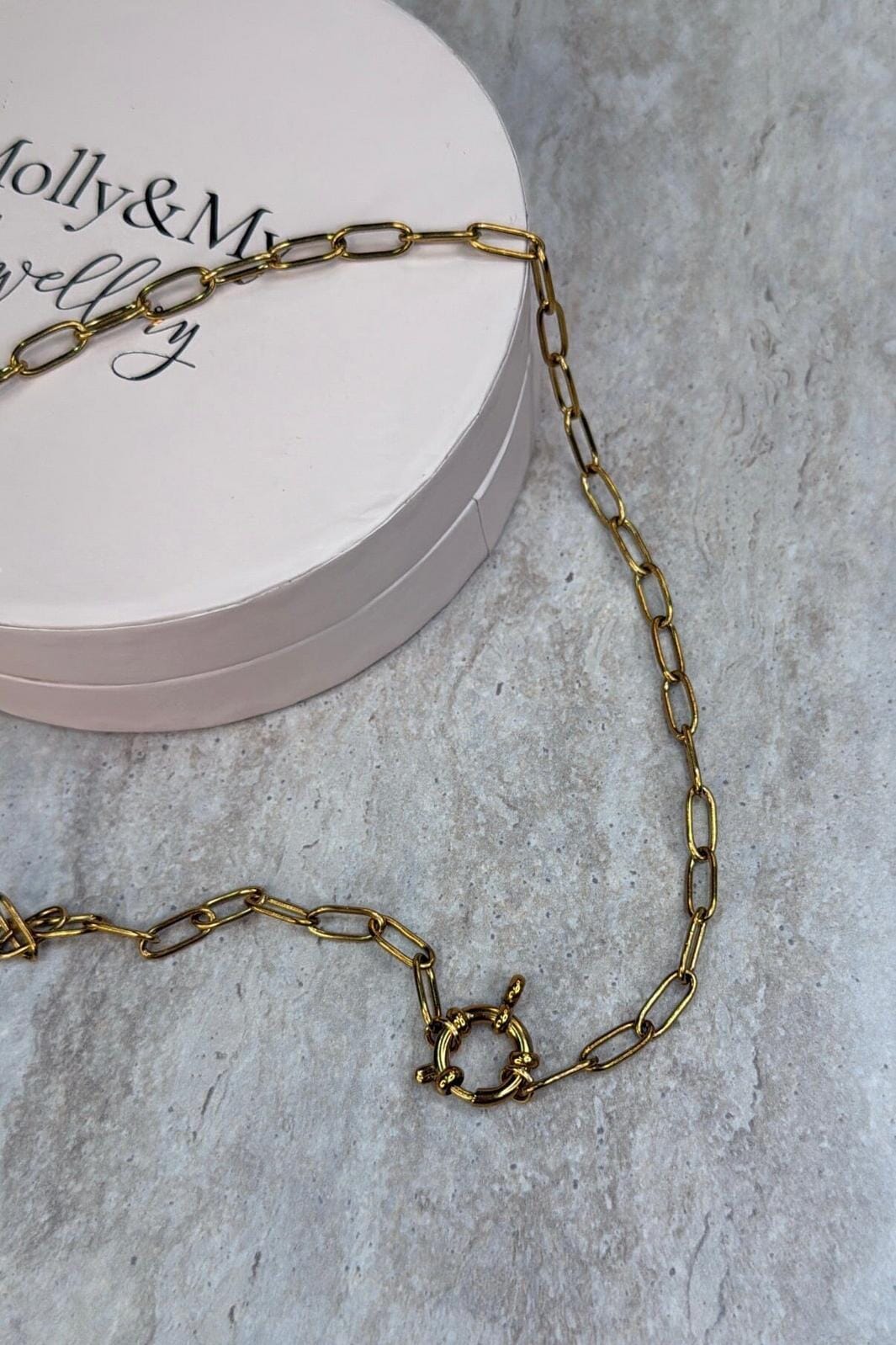 Halskette von Molly&My Jewellery, gefertigt aus Edelstahl mit einer goldfarbenen Beschichtung. Die Kette hat längliche Glieder und einen runden Verschluss.