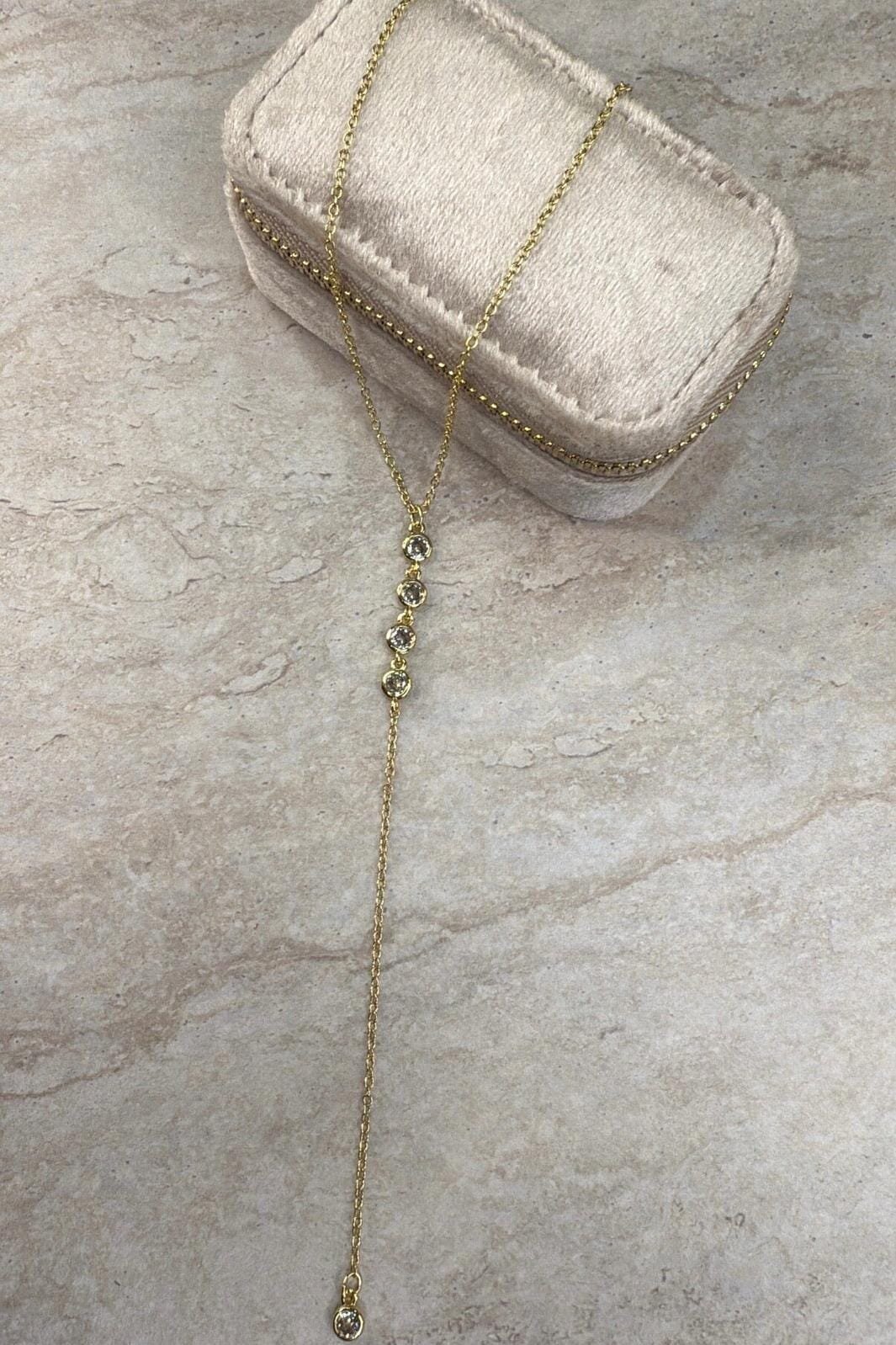 Vergoldete Halskette von Molly&My Jewellery mit Y-Ketten-Design. Die Kette besteht aus Messing und hat kleine kreisförmige Elemente mit Steinen.