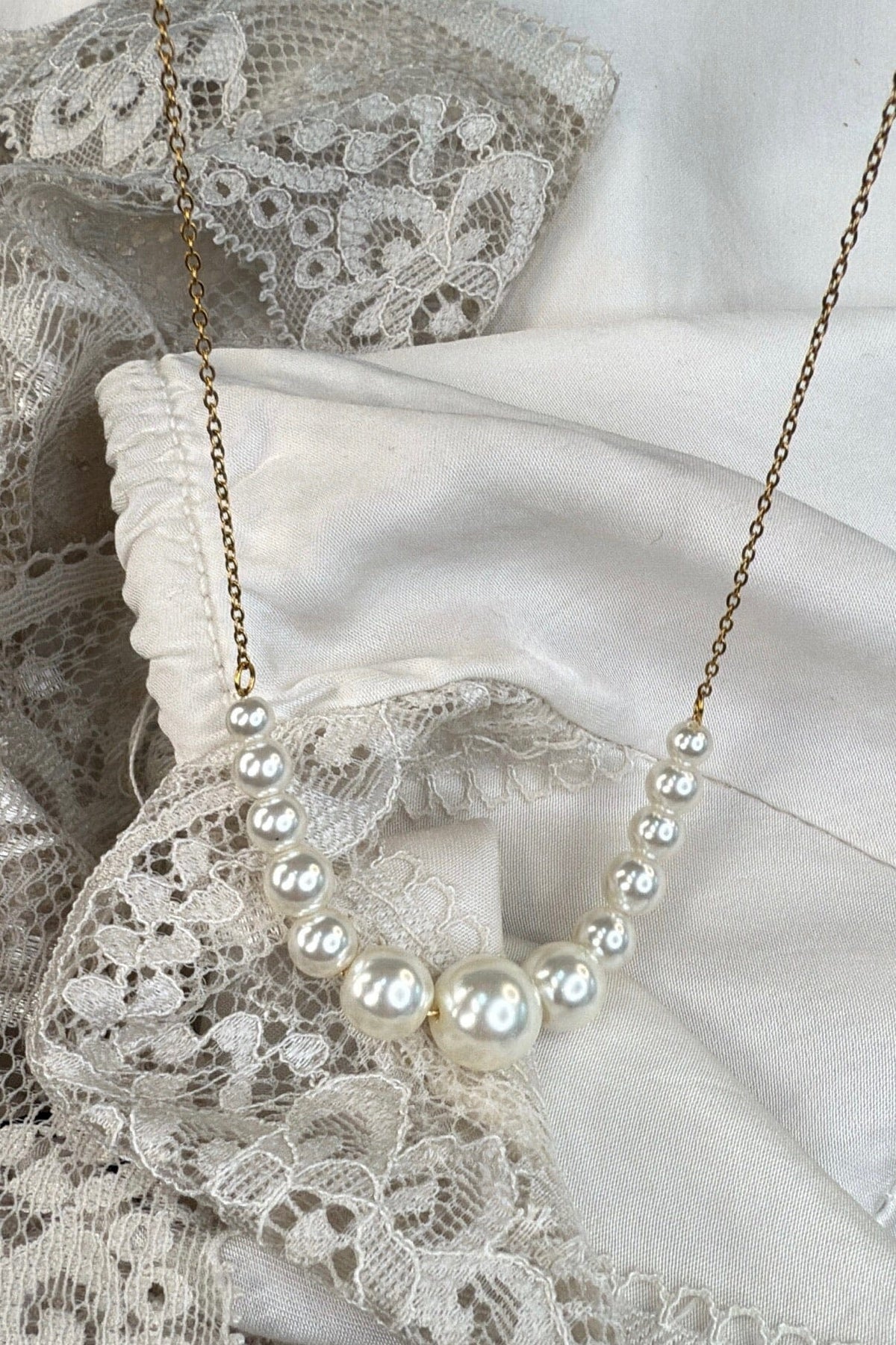 Halskette von Molly&My Jewellery mit abgestuften, imitieren Perlen an einer dünnen, goldfarbenen Kette. Die Perlen variieren in der Größe von klein bis groß.