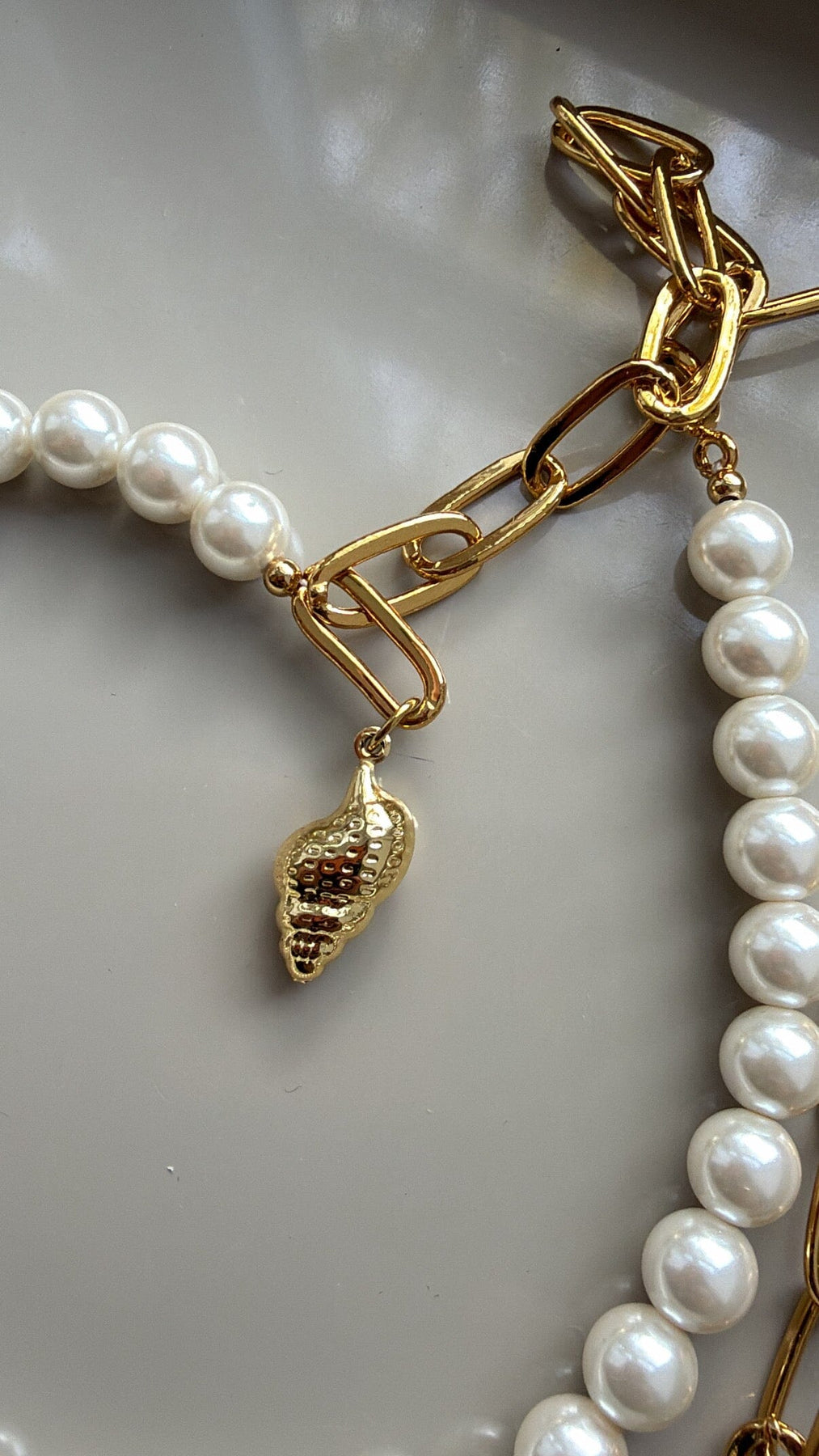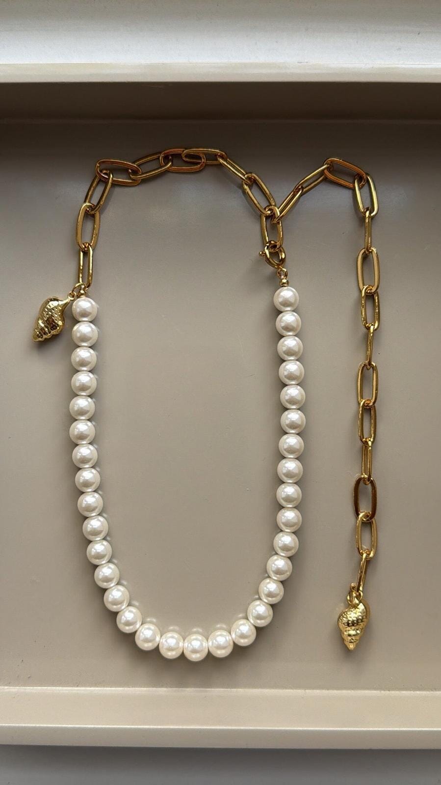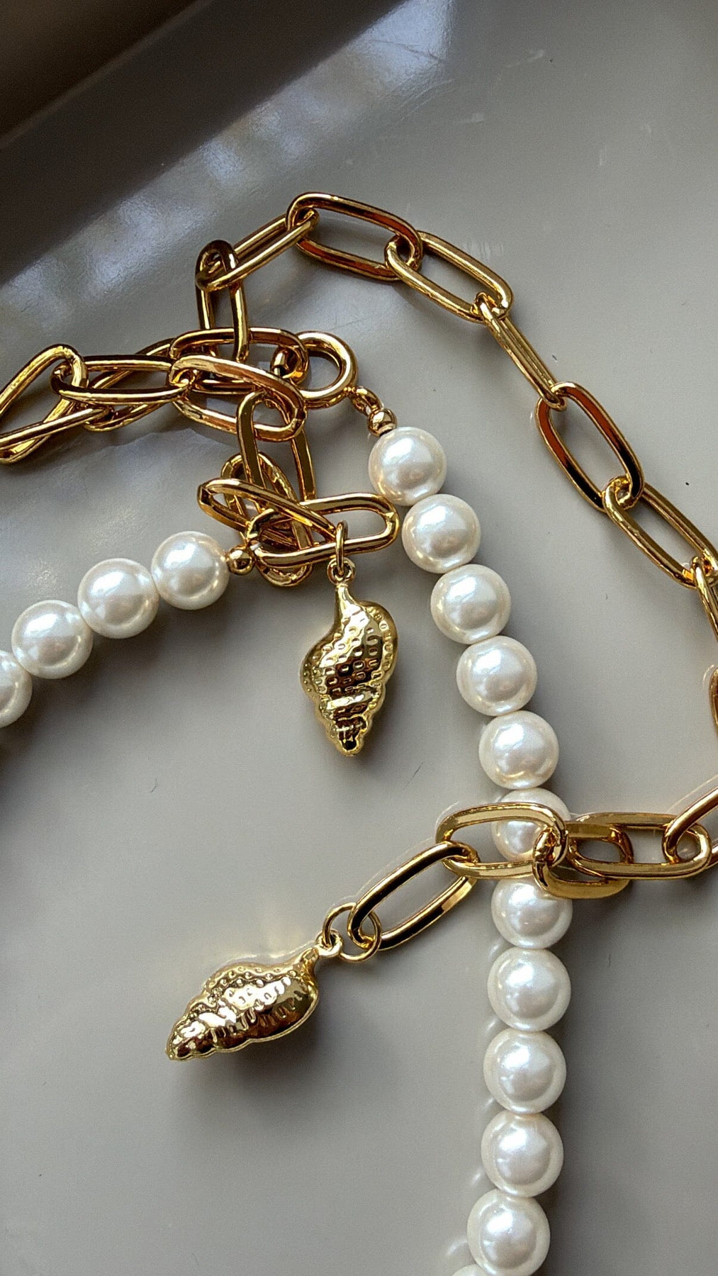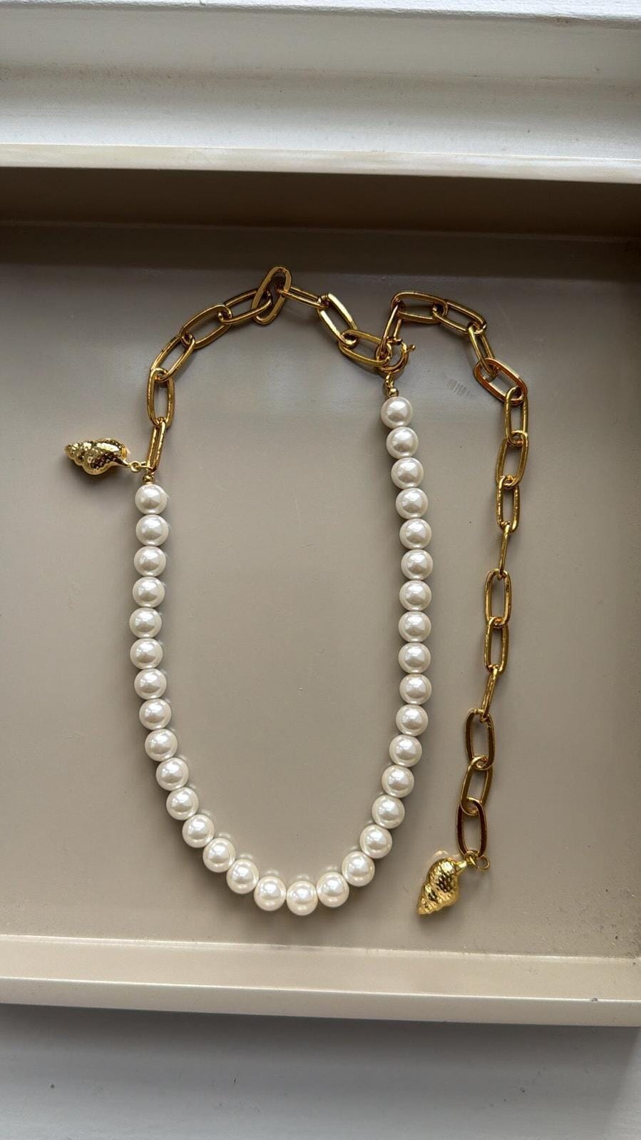 Vergoldete Halskette von Molly&My Jewellery. Das Design kombiniert weiße Perlen mit goldfarbenen Kettengliedern in einer halb-halb Aufteilung.