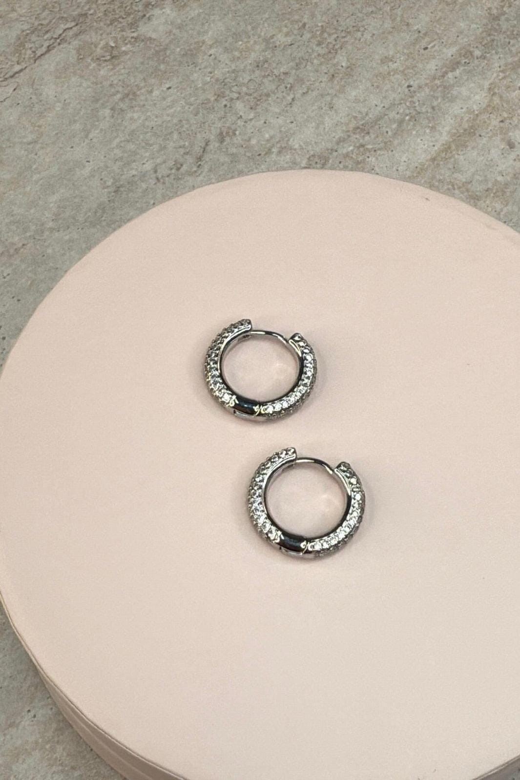 Runde Ohrringe von Molly&My Jewellery in einem silberfarbenen Ton. Die Ohrringe sind rundum mit kleinen Steinen verziert.