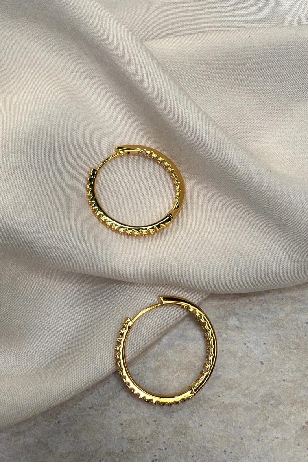 Vergoldete Creolen von Molly&My Jewellery. Die Ohrringe bestehen aus Messing mit kleinen klaren CZ-Steinen entlang des äußeren Rands in einer runden Form.