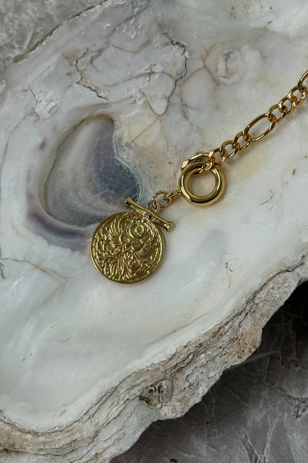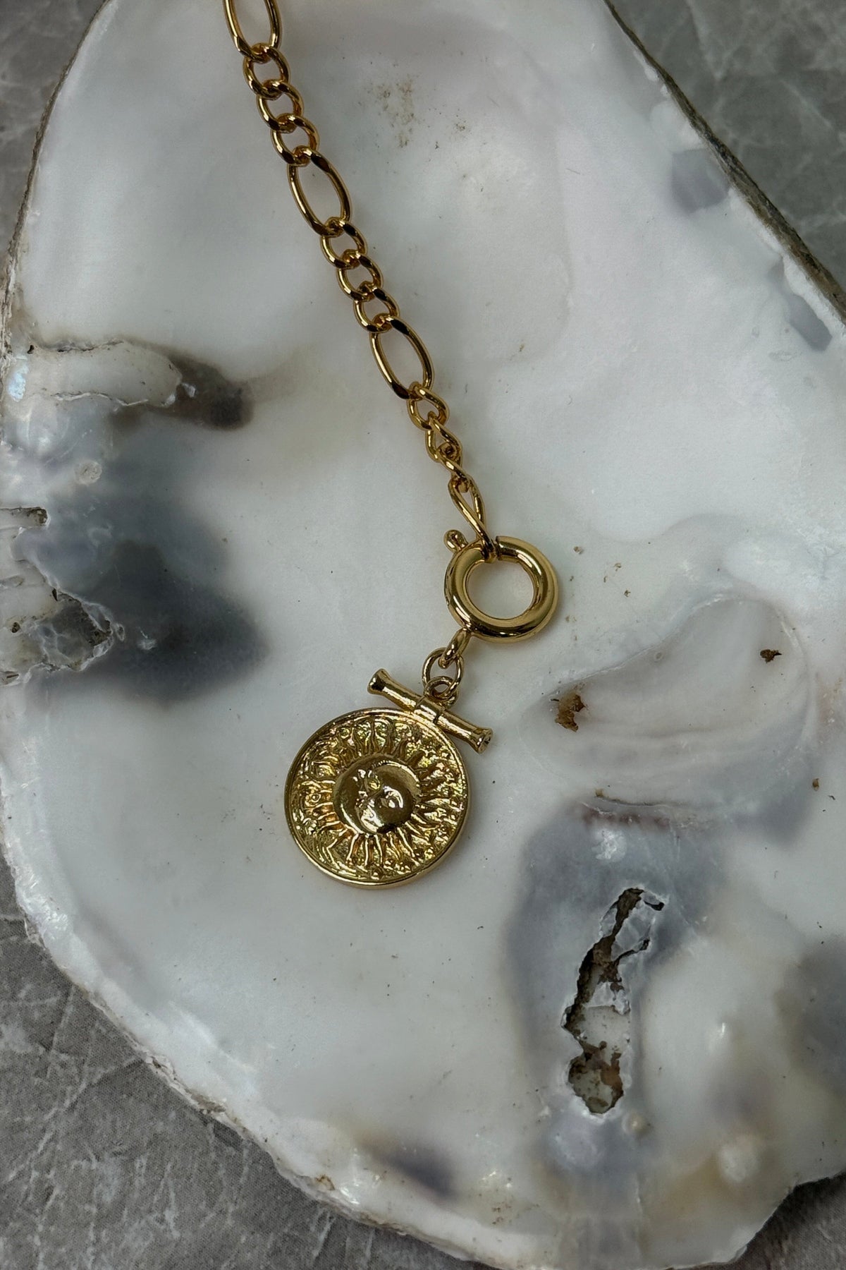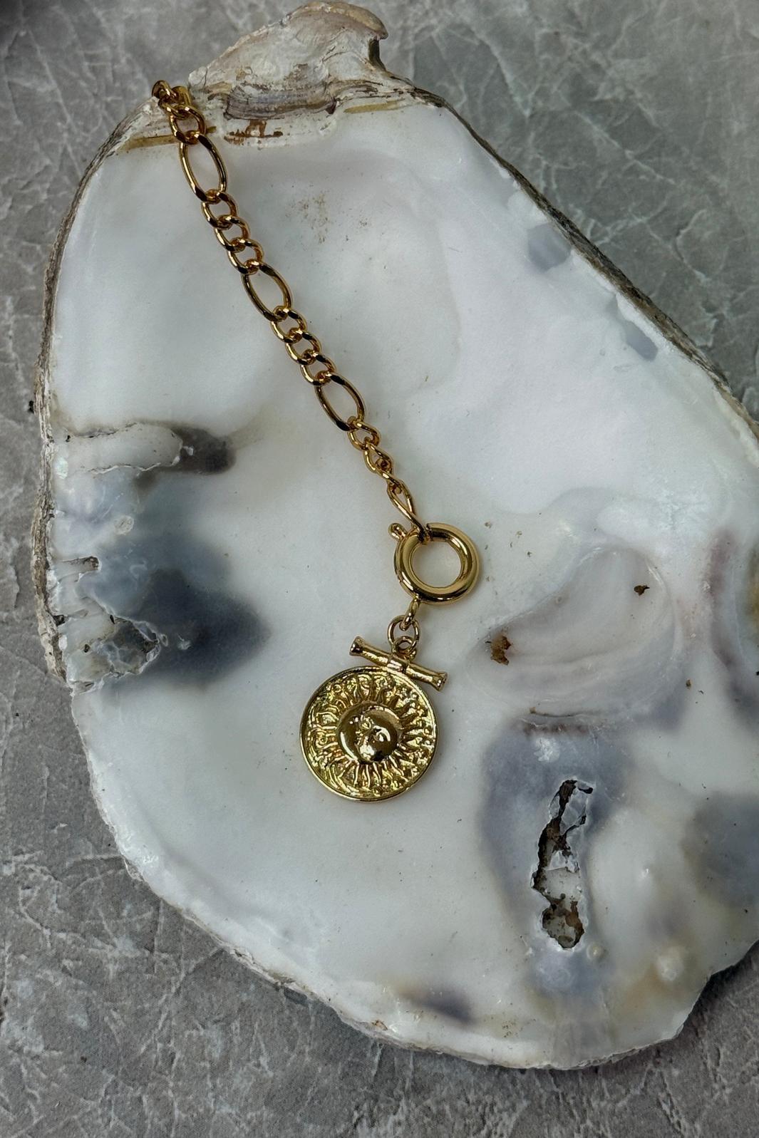 Vergoldete Medaillonkette aus Edelstahl von Molly&My Jewellery x Melanie Due mit eingraviertem Sonnen- oder Gesichtsmotiv an einer Kette mit ovalen Gliedern.