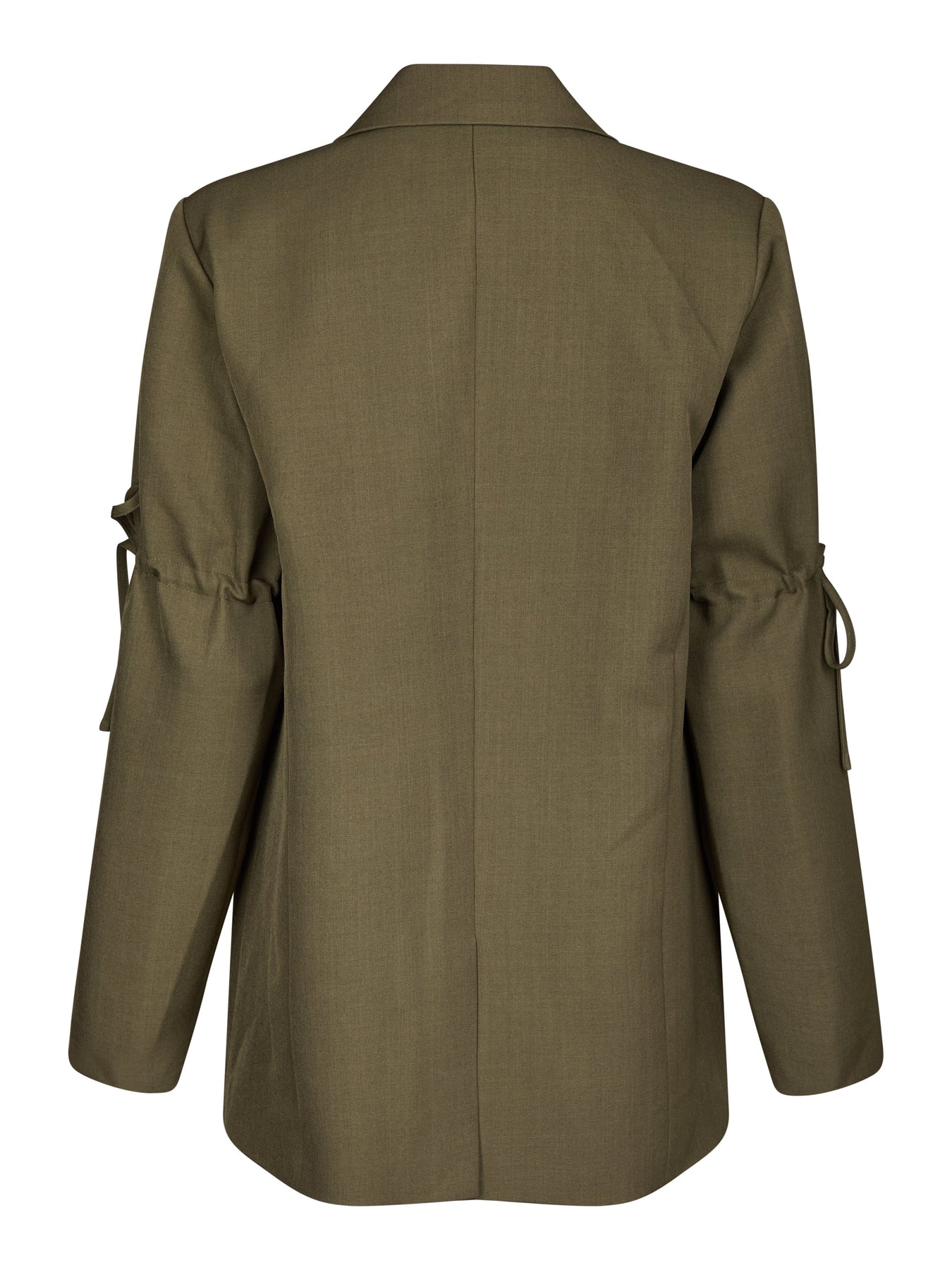 Blazer von Molly&My x Julie Elgaard in Khakigrün. Der Blazer hat Schnürdetails an den Ärmeln, dekorative Knöpfe vorne und zwei Fronttaschen mit Patten.