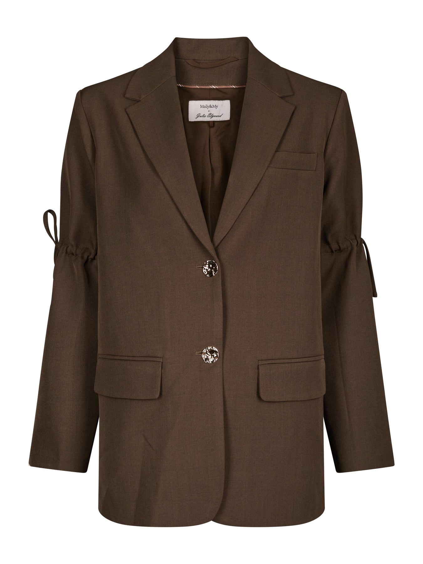 Dunkelbrauner Blazer von Molly&My x Julie Elgaard mit Schnürdetails an den Ärmeln. Der Blazer hat eine oversized Passform und einen V-Ausschnitt.