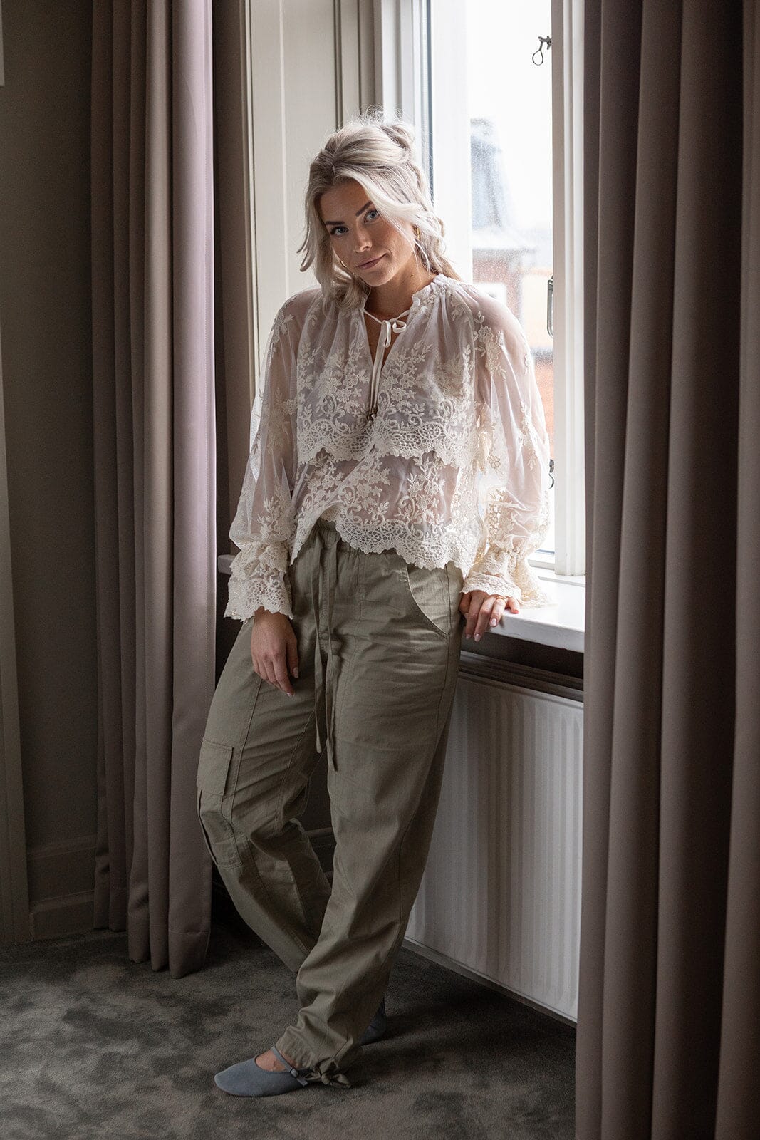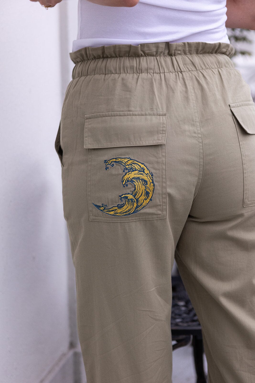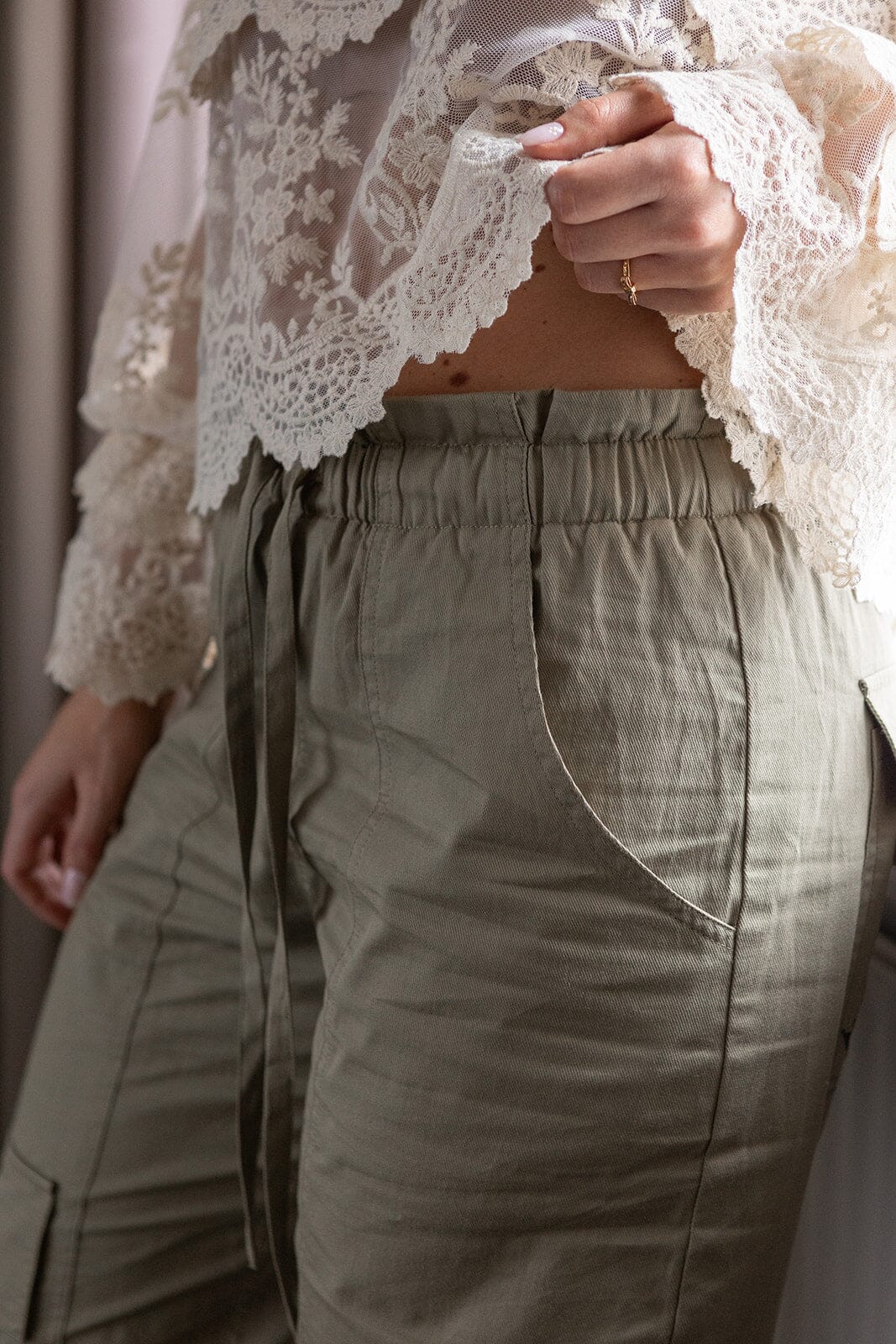 Weite Hose von Molly & My X Melanie Due in einem gedeckten Grünton. Die Hose hat eine hohe Taille und bodenlange Beine mit Details wie Stickereien und Rüschen.